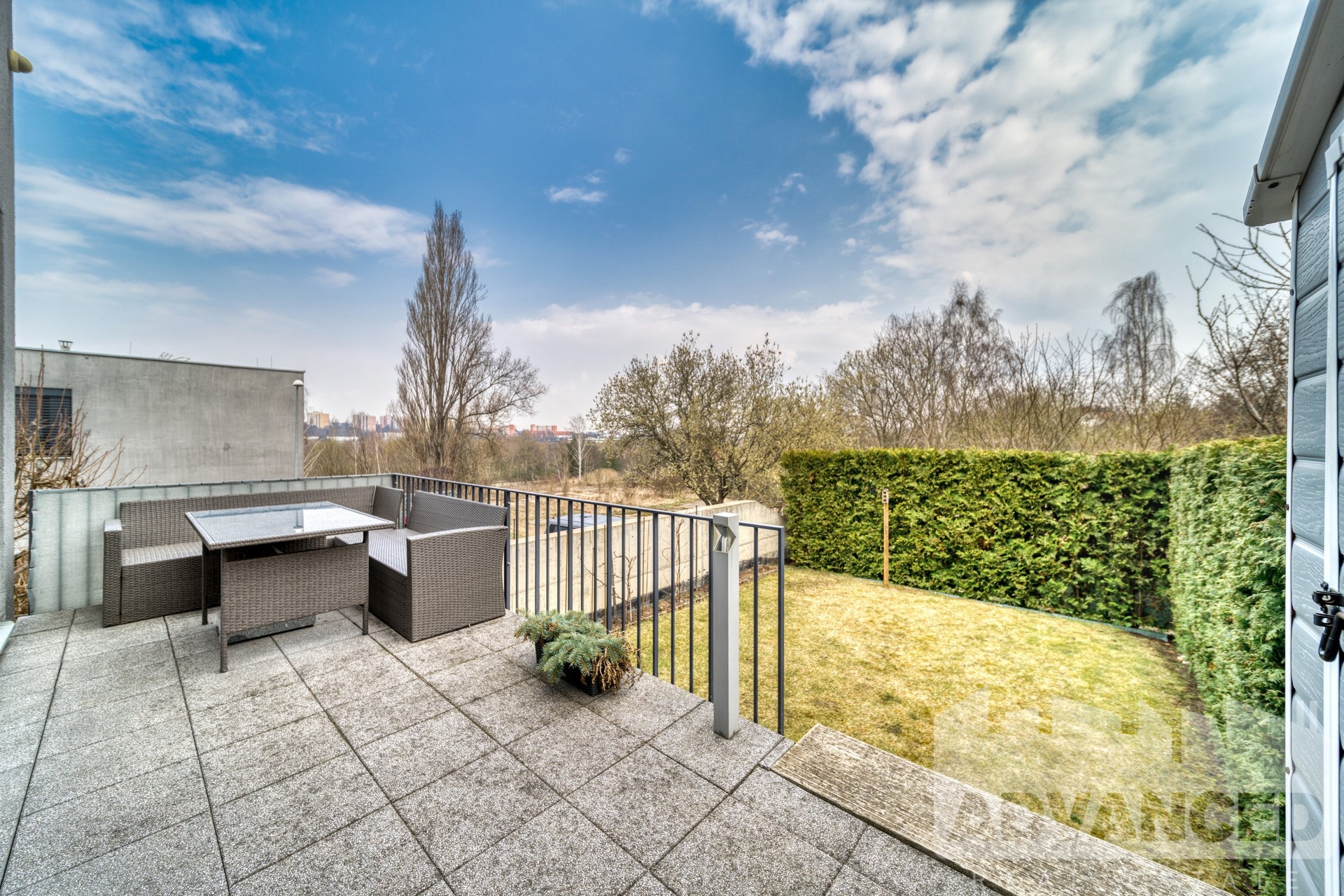 Projekt se nachází v poklidné vilové čtvrti, je na konci slepé ulice a je obklopen zelení. V tomto případě jde spíše o bydlení v polovině dvojdomu přístupného z otevřeného, krásně upraveného prostoru, ale technicky je zapsán jako byt.