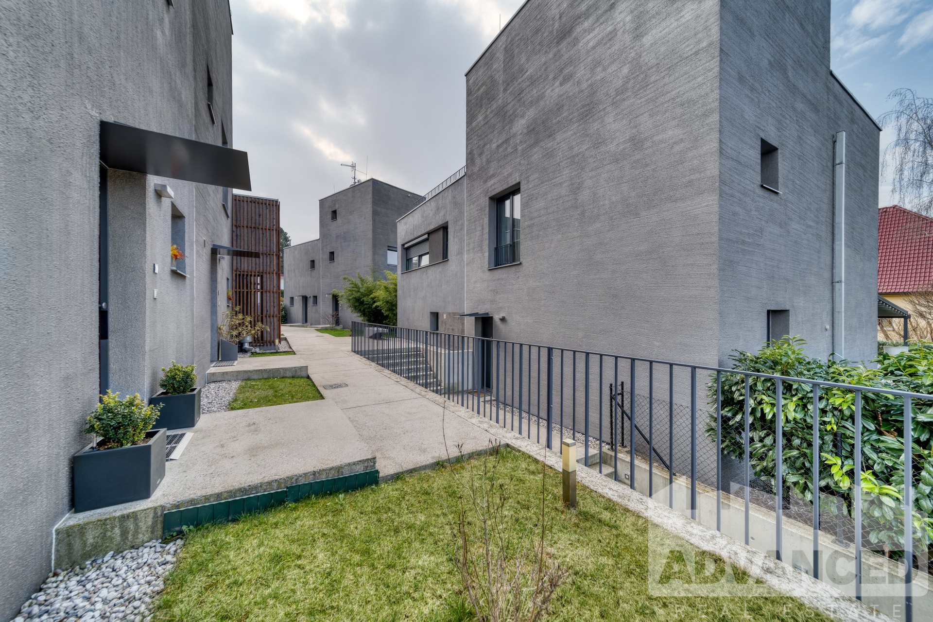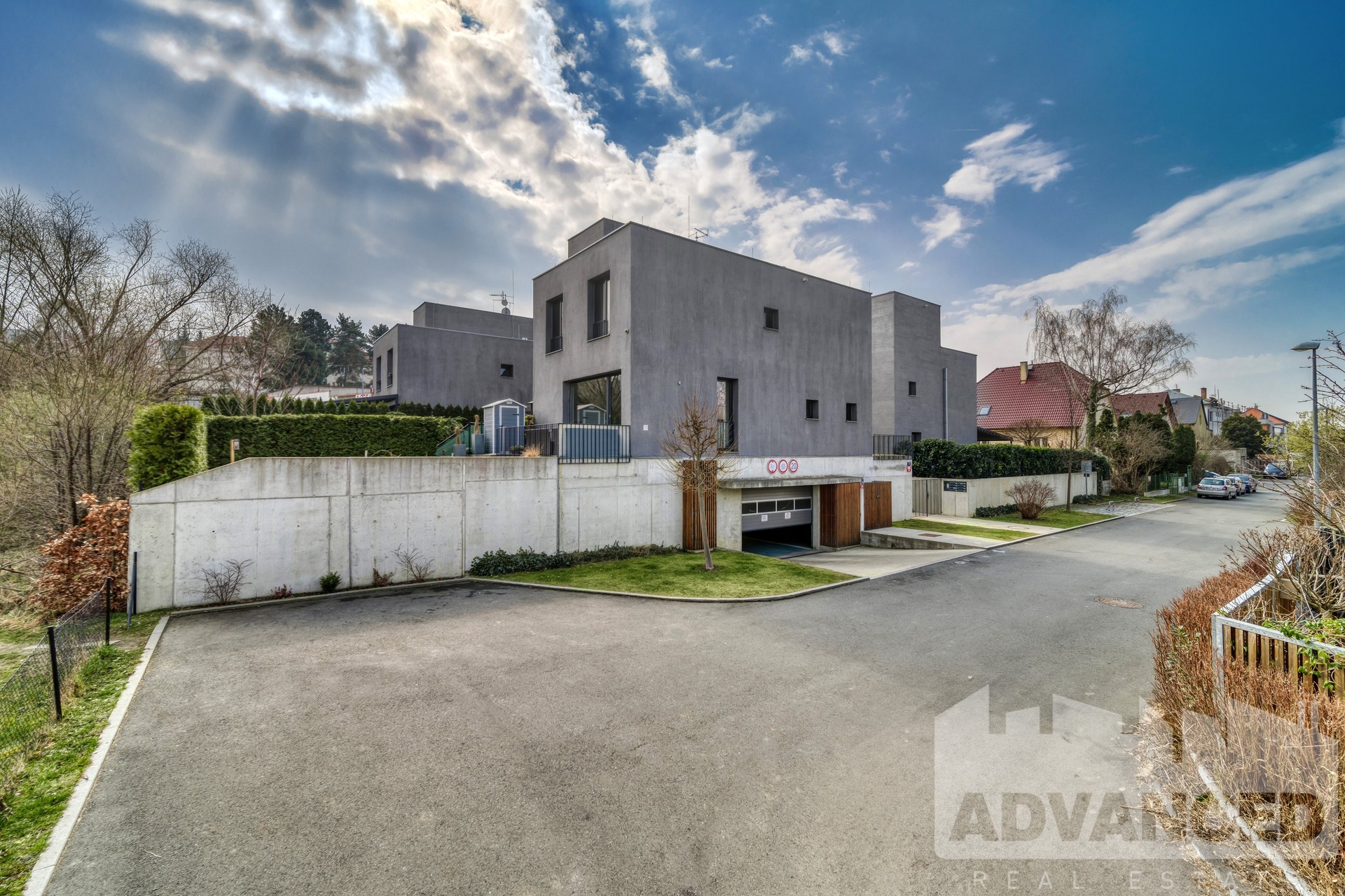 Jedinečný moderní mezonetový byt 4+kk situovaný jako polovina dvojdomu, o rozloze 119.7 m2 s terasou 9.35 m2 a soukromou zahrádkou 56.8 m2, s 2 prostornými parkovacími stáními v podzemní garáži a se sklepem 2.5 m2 v architektonicky oceněném rezidenčním projektu Origami.