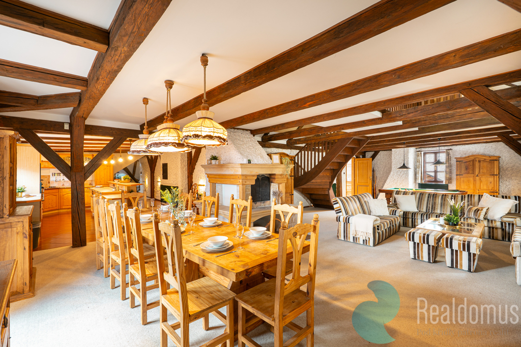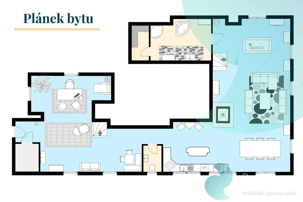 Společenská část bytu se rozprostírá v nižším patře a zaujme svou velkorysostí, atmosférou i promyšleným dispozičním řešením. Dominantou prostoru je prostorný obývací pokoj s krbem, který tvoří přirozené centrum domova a místo pro setkávání i odpočinek. Na obývací část plynule navazuje jídelna s dostatkem prostoru pro rodinná i přátelská setkání a moderní kuchyň vybavená vestavěnými spotřebiči, kvalitní pracovní plochou a velkorysým úložným prostorem. Celý interiér působí útulně a harmonicky, s důrazem na kvalitní materiály a detailní zpracování.