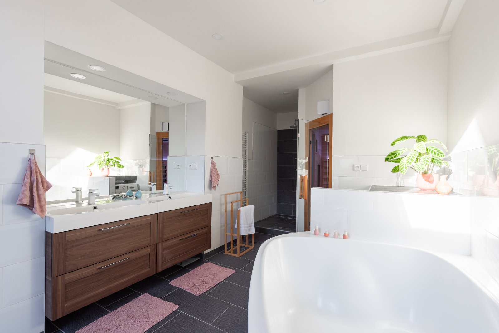 Na spodní úrovni se nachází velká vstupní hala, hlavní ložnice (22 m²) a opravdu výjimečná koupelna (21m2) s vanou pro dva, prostorným sprchovým koutem, dvojitým umyvadlem a vlastní infrasaunou. Příjemný dojem umocňují velká střešní okna, která poskytují dostatek denního světla. Na tomto podlaží je také velká vestavná skříň ve vstupní chodbě (23m2) a samostatná toaleta s plynovým kotlem.