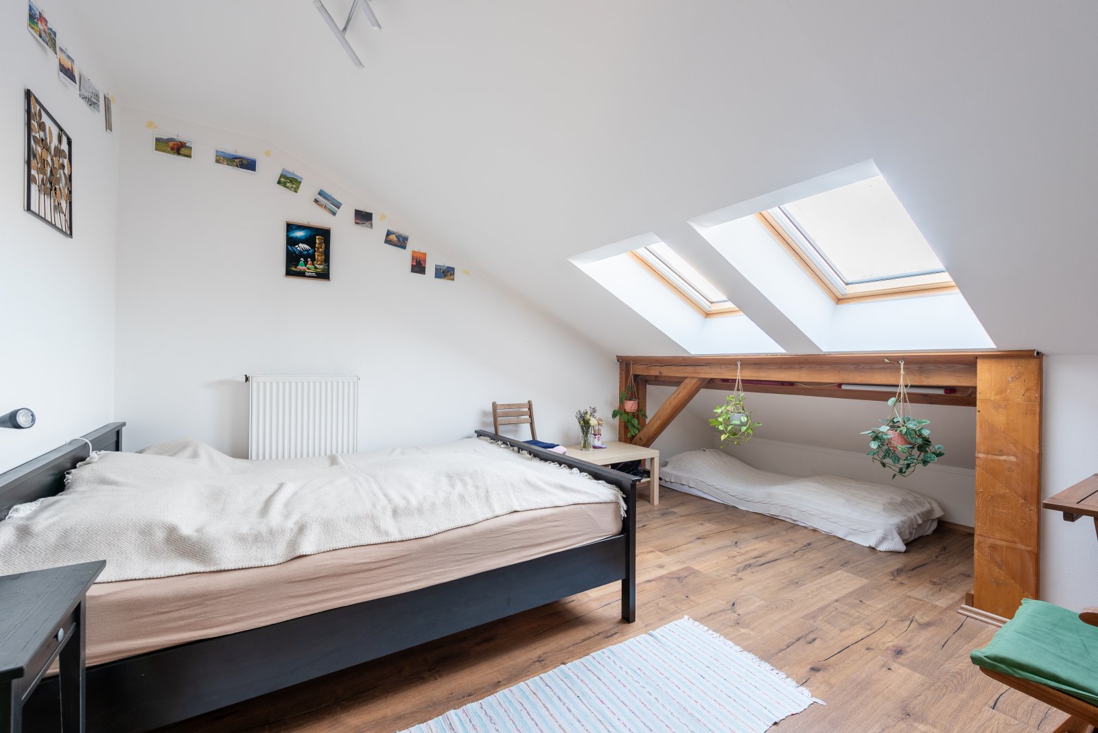 V nejvyšším patře domu budete bydlet v naprostém klidu, s krásným výhledem a příjemnou atmosférou, kterou dotvářejí velká dřevěná střešní okna i klimatizace zajišťující komfort v každém ročním období. Teplo i teplou vodu zajišťuje vlastní plynový kotel. Důležitou informací pro bydlení v posledním patře je také to, že střecha prošla v roce 2022 kompletní rekonstrukcí.
