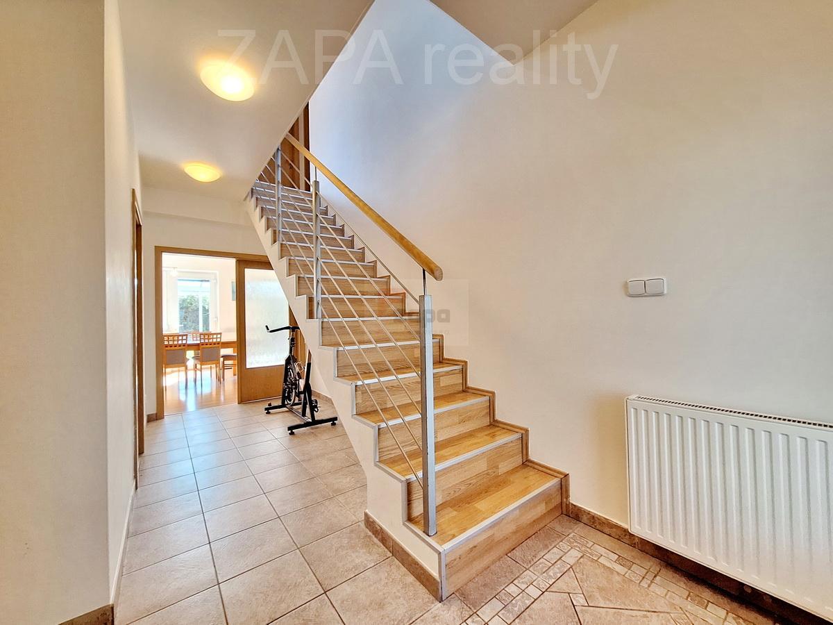 Vybavení: kuch. linka s velkou spíží, vestavěnné spotřebiče (lednice, myčka, el. varná deska, digestoř, el. trouba a mikrovlnná trouba), centrální vysavač, optický kabel ve všech místnostech, zaabezpečovací systém, domácí telefon, biokrb, ve všech oknech bezpečnostní skla a stínící žaluzie, dálkové ovládání garážových a vjezdových vrat, zásuvka 400V v garáži