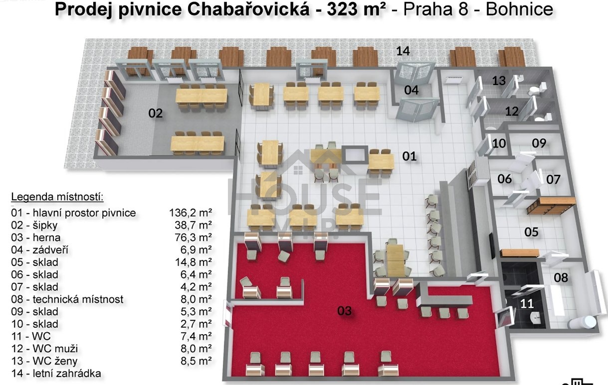 Stávající budova je zkolaudována jako Klub s hernou, má dva samostatné vstupy, novou keramickou podlahu, plynové ústřední topení, vzduchotechniku a napojení na všechny městské sítě. Venkovní terasa přirozeně navazuje na okolní zeleň a je oblíbeným místem místních obyvatel.