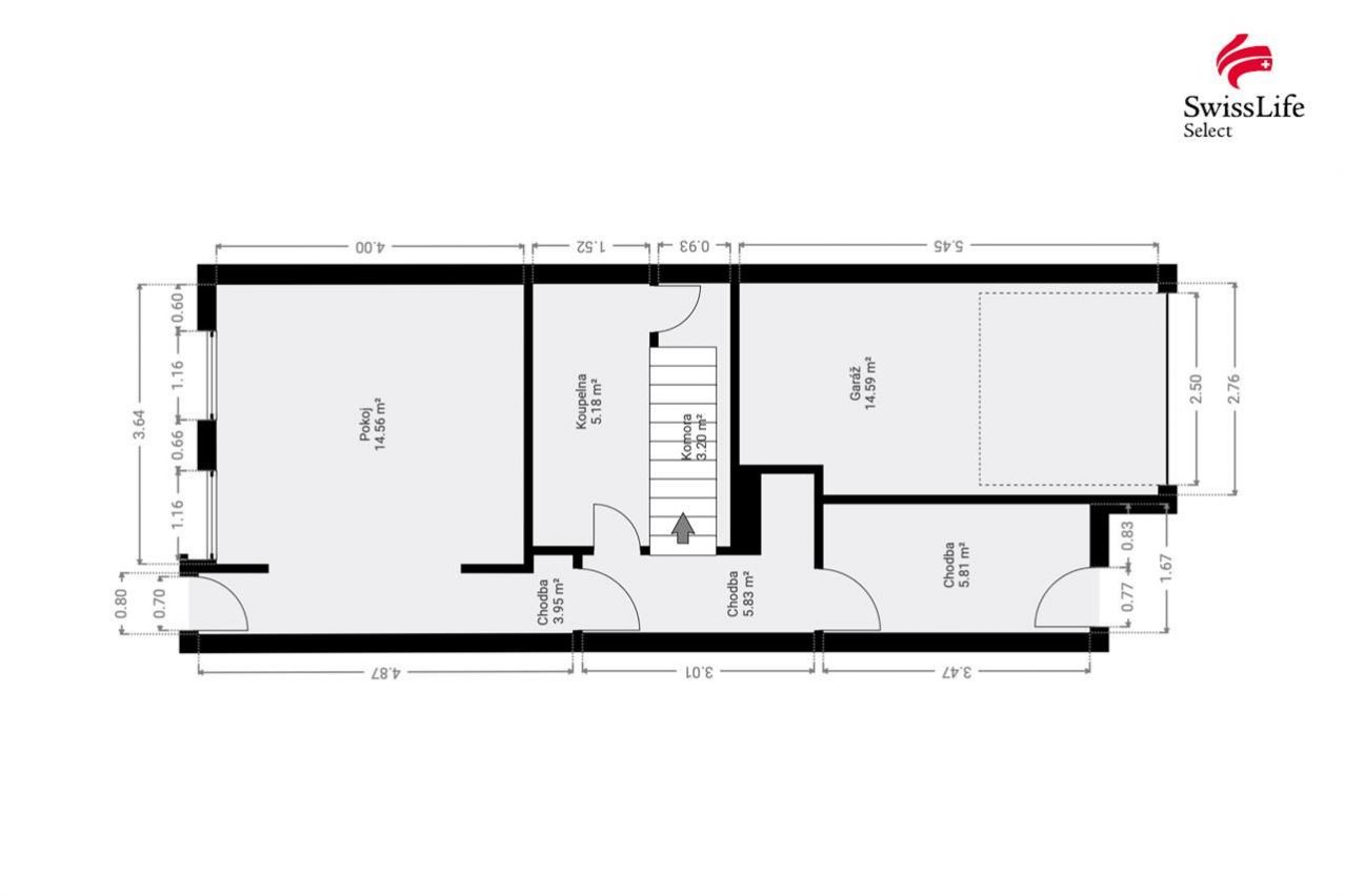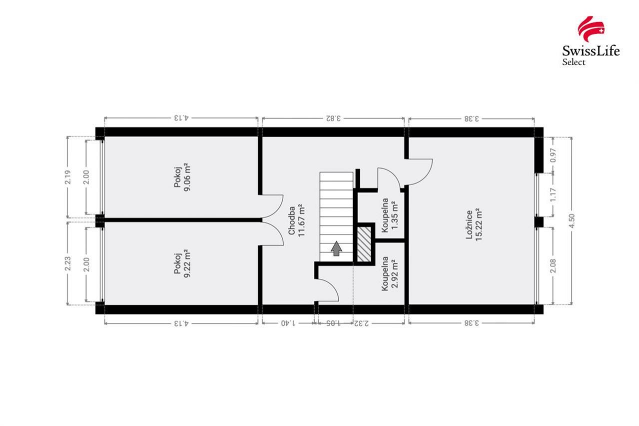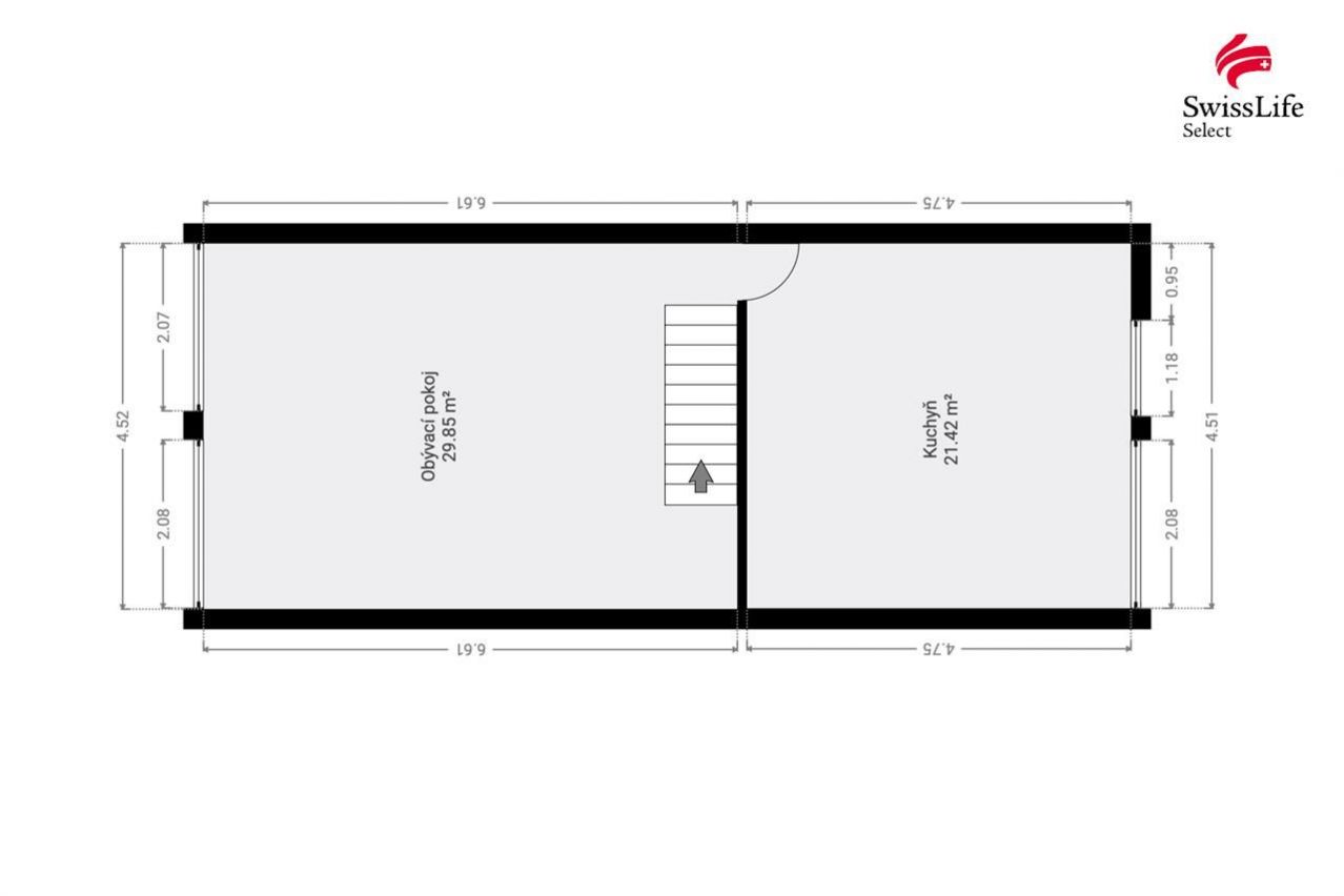 prostorný obývací pokoj (30 m), samostatná kuchyň s jídelnou, schodiště