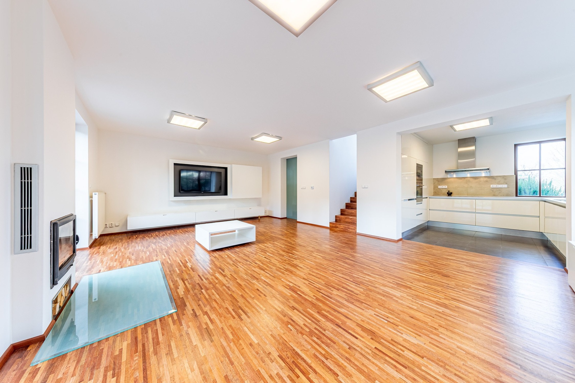 V 1.NP se nachází předsíň s vestavěnou skříní, toaleta, kuchyně se spižírnou, obývací pokoj s krbem a vstupem na terasu, dále garáž s přímým propojením (tzv. suchou nohou) s domem. Kuchyně je vybavena kuchyňskou linkou včetně spotřebičů (vestavěná lednice a mrazák, vestavěná trouba a mikrovlnná trouba, varná deska, digestoř a myčka).