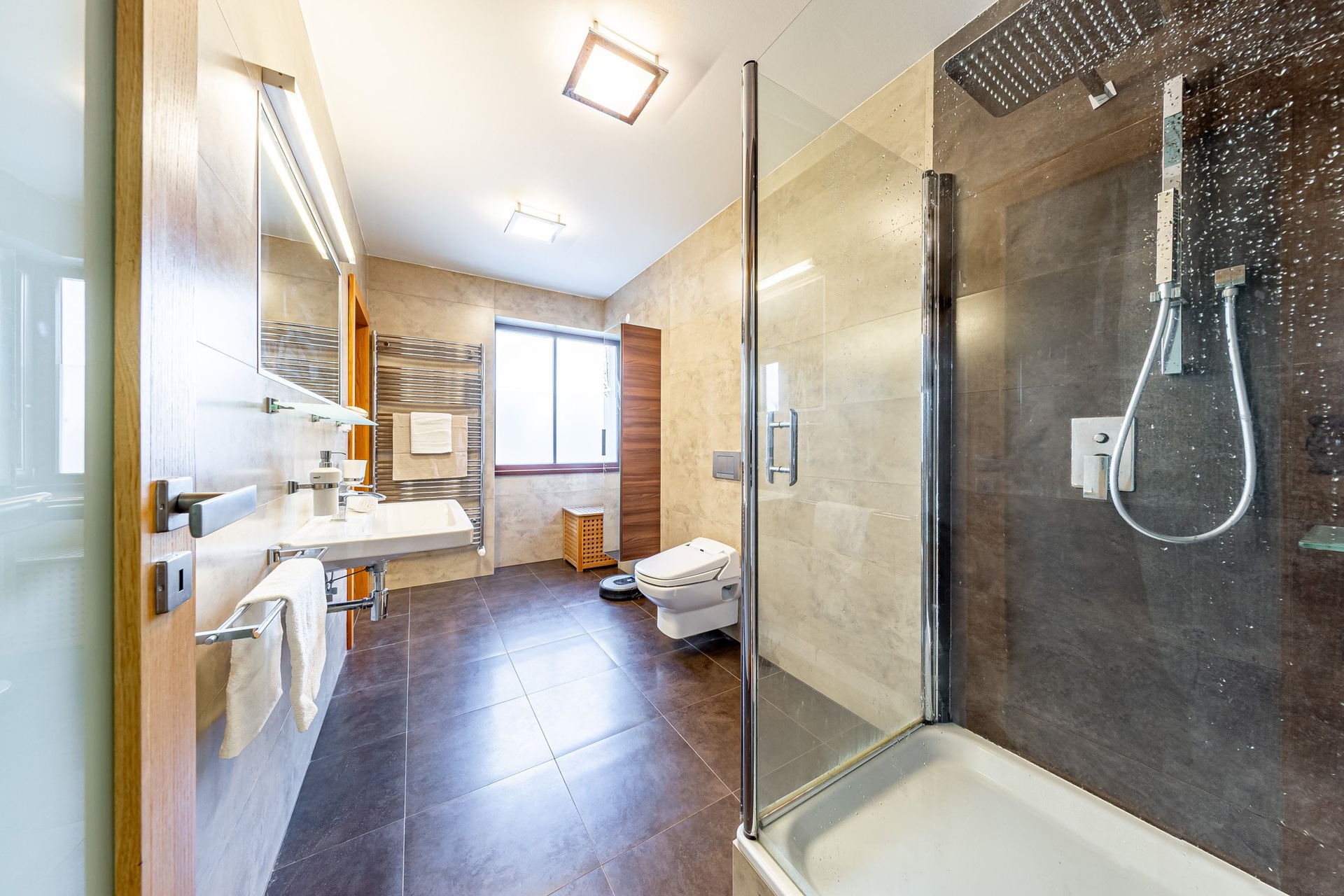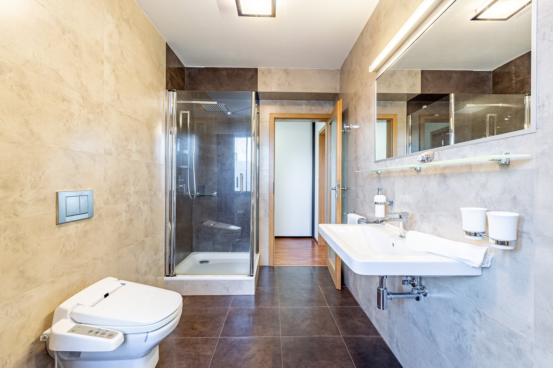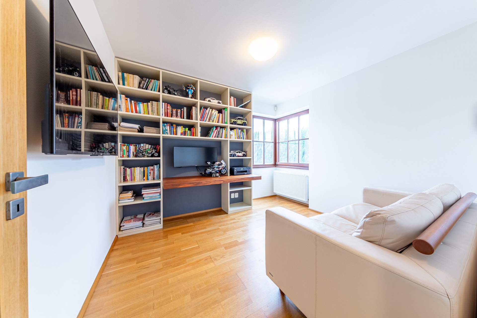 V 2.NP se nachází velká ložnice s šatnou propojenou s prostornou koupelnou se sprchovým koutem a toaletou. Dále je zde pracovna s vestavěnou knihovnou a pracovním místem, pokoj bez vybavení, pokoj s vestavěným nábytkem, druhá koupelna s vanou, toaletou a prostorem pro pračku se sušičkou. Na chodbě se pak nachází vestavěná šatní skříň.