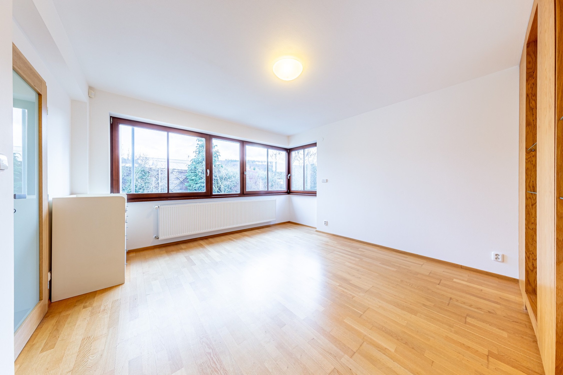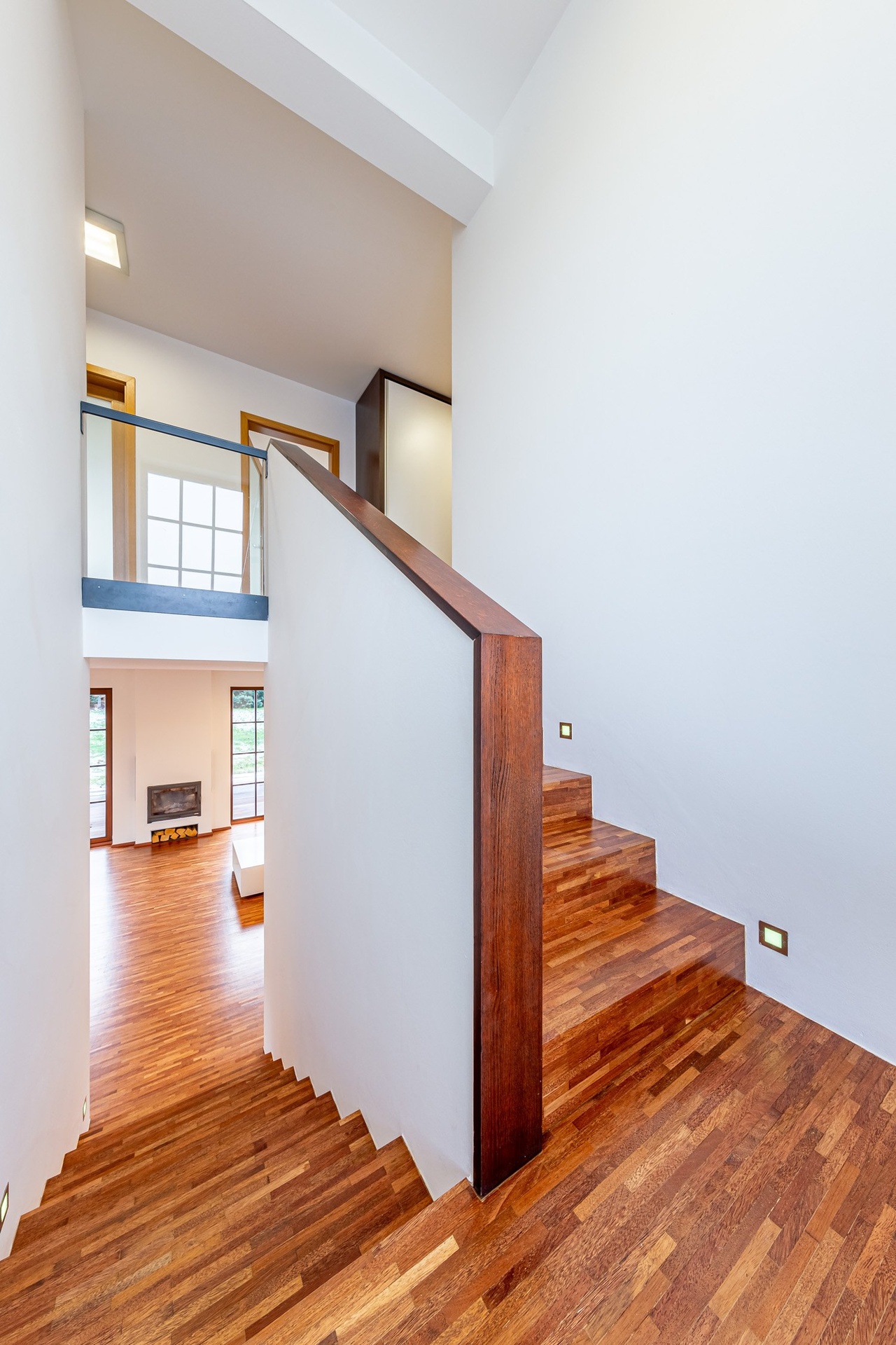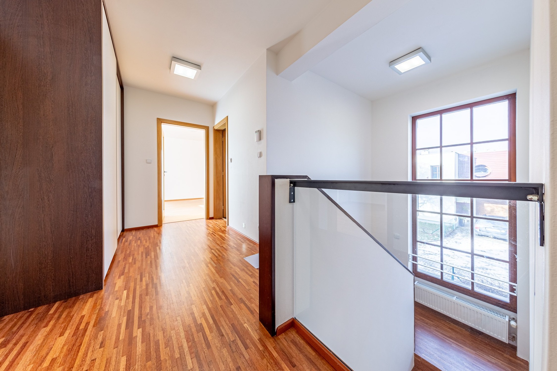 V 2.NP se nachází velká ložnice s šatnou propojenou s prostornou koupelnou se sprchovým koutem a toaletou. Dále je zde pracovna s vestavěnou knihovnou a pracovním místem, pokoj bez vybavení, pokoj s vestavěným nábytkem, druhá koupelna s vanou, toaletou a prostorem pro pračku se sušičkou. Na chodbě se pak nachází vestavěná šatní skříň.