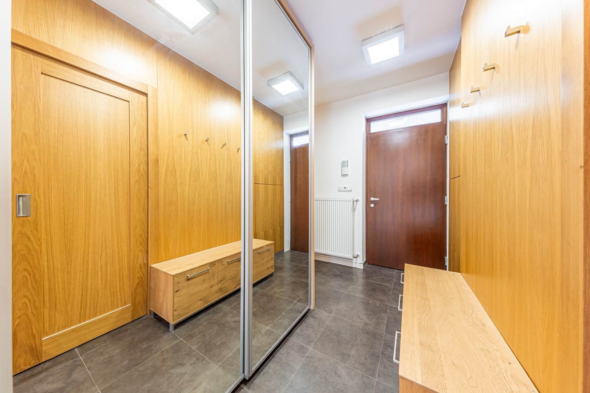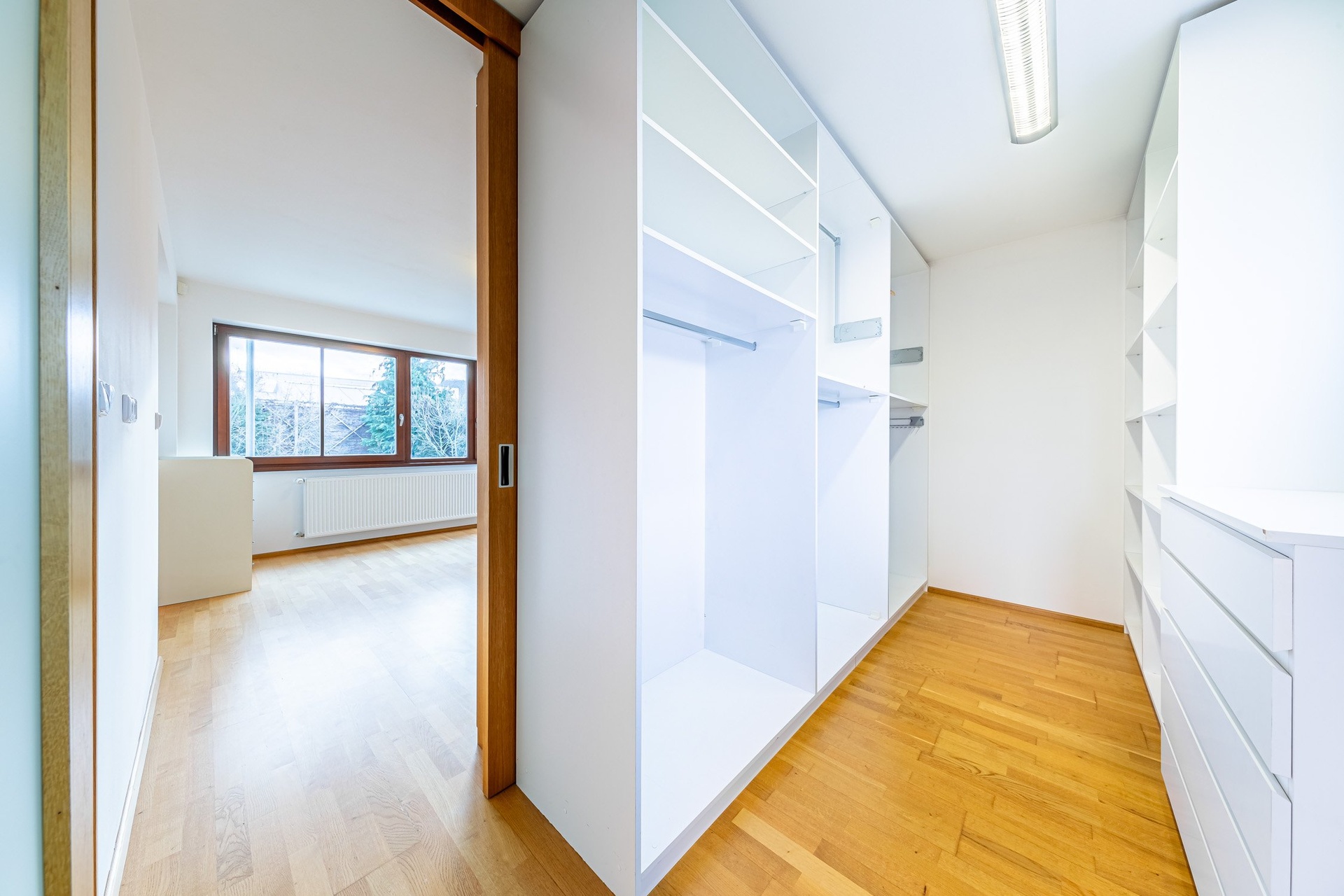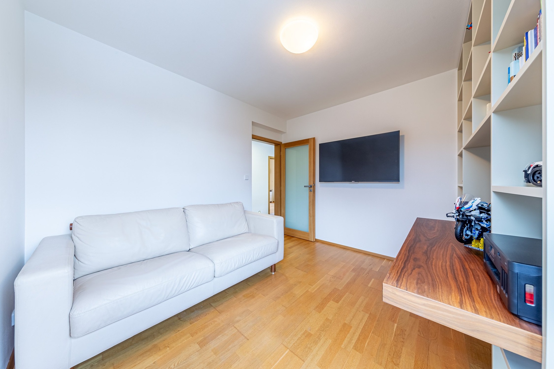 V 2.NP se nachází velká ložnice s šatnou propojenou s prostornou koupelnou se sprchovým koutem a toaletou. Dále je zde pracovna s vestavěnou knihovnou a pracovním místem, pokoj bez vybavení, pokoj s vestavěným nábytkem, druhá koupelna s vanou, toaletou a prostorem pro pračku se sušičkou. Na chodbě se pak nachází vestavěná šatní skříň.