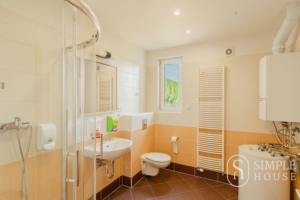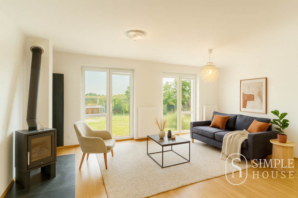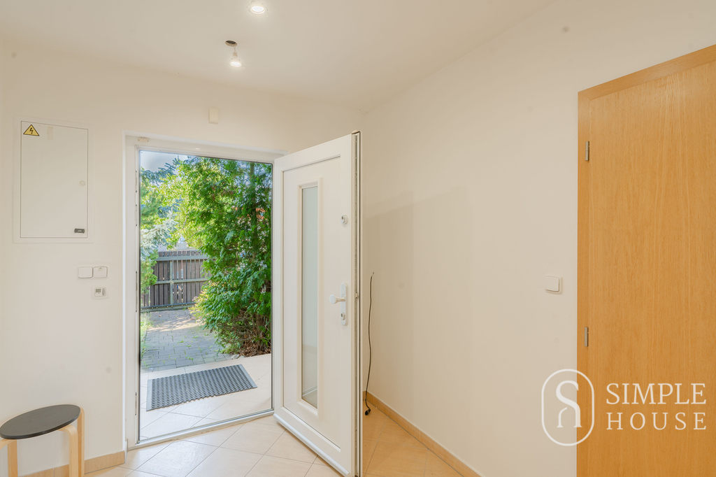 Vstupní část domu tvoří prostorná předsíň, která plynule přechází do světlého obývacího pokoje s krbem a velkoformátovými okny zajišťujícími dostatek denního světla. Odtud je přímý vstup na pečlivě udržovanou zahradu, ideální pro relaxaci, rodinné posezení či grilování.