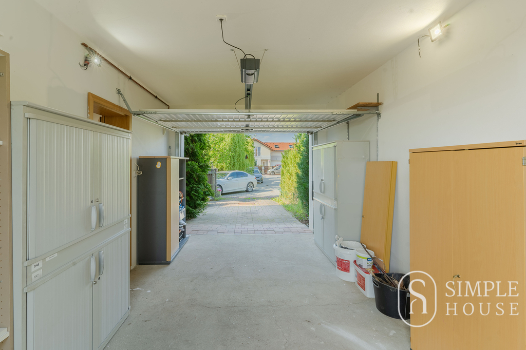 Garážová vrata značky Hörmann s automatickým pohonem ProMatic umožňují pohodlný vjezd; garáž má průchozí vstup přímo na zahradu. Elektrická posuvná brána a oplocení zajišťují soukromí a bezpečí, dům je navíc vybaven bezpečnostním systémem s alarmem. Vytápění zajišťuje plynový kotel, v obývacím pokoji je možnost přitápět krbem. Okna jsou vybavena předokenními roletami, které pomáhají regulovat teplotu a zvyšují komfort i soukromí.