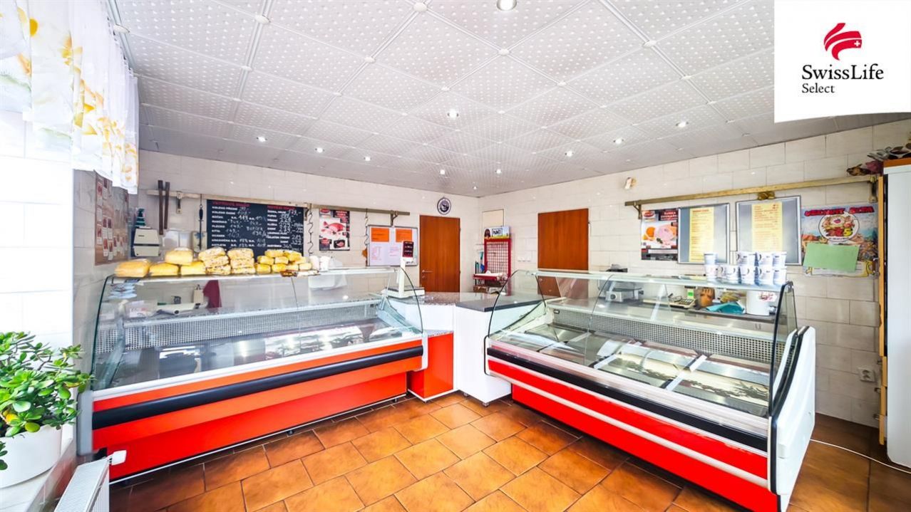 Součástí nemovitosti je také plně vybavený obchodní prostor dlouhodobě využívaný jako řeznictví. K dispozici jsou dvě sklepní místnosti, technické zázemí a místnost s velkou chladicí technologií.