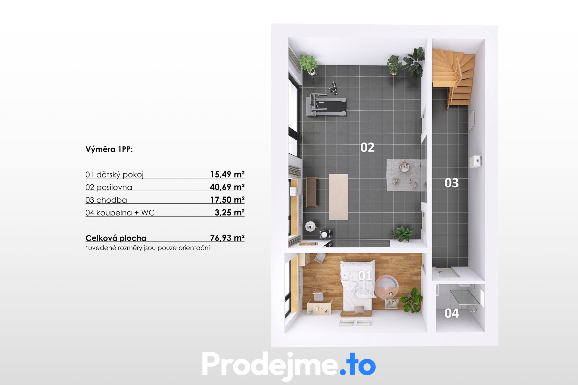 V přízemí domu najdete dětský pokoj a nadstandardně velkou místnost o velikosti téměř 40 m². Prostor je natolik velkorysý, že bez problémů pojme pracovnu, dětský koutek i domácí fitness. Spodní patro doplňuje druhá koupelna se sprchovým koutem a toaletou a prostorná chodba opět s místem pro šatnu.