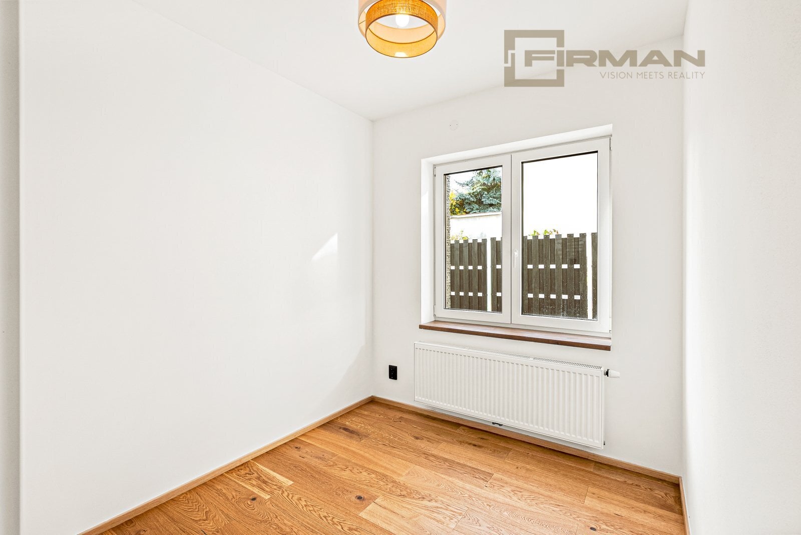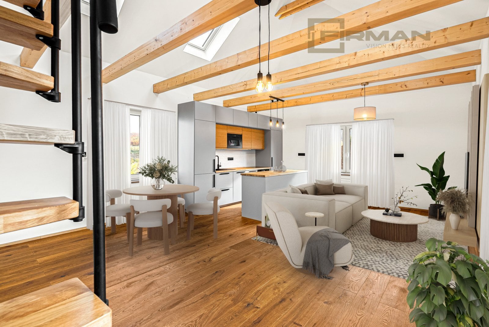 Horní byt zaujme otevřeným obývacím prostorem s novou kuchyní, vysokými stropy a přiznanými trámy. Samozřejmostí jsou moderní spotřebiče a dálkově ovládané střešní žaluzie. Součástí je také podkrovní místnost vhodná jako ložnice, pracovna nebo úložný prostor.