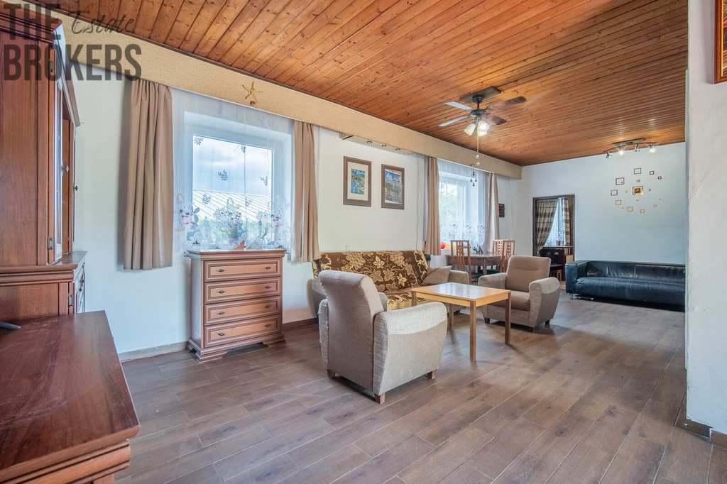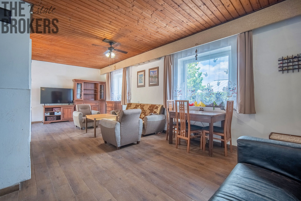 Na zahradě s ovocnými stromy stojí zahradní domek se saunou. Přízemí tvoří prostorný obývací pokoj (cca 38 m²) a samostatná kuchyň (12 m²), koupelna se sprchovým koutem a samostatná toaleta. Podkroví nabízí koupelnu s vanou a toaletou a tři samostatné pokoje, z nichž jeden má šatnu a terasu. Dům sice není zateplený, ale díky masivním cihlovým stěnám o tloušťce 50–60 cm nabízí výborné tepelně-izolační vlastnosti. Hlavním zdrojem vytápění jsou akumulační kamna, ohřev vody zajišťuje bojler. V obývacím pokoji je krb, který přináší příjemnou atmosféru. V jednom z pokojů je instalována klimatizační jednotka Samsung. Nemovitost je napojena na obecní vodovod a kanalizaci. Součástí domu je sklep o výměře 15 m². Nachází se zde také studna s užitkovou vodou. Střešní krytina i nosná konstrukce je v dobrém technickém stavu.