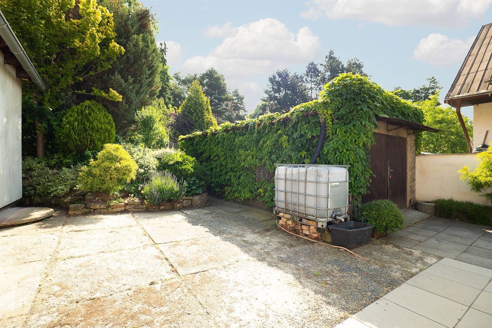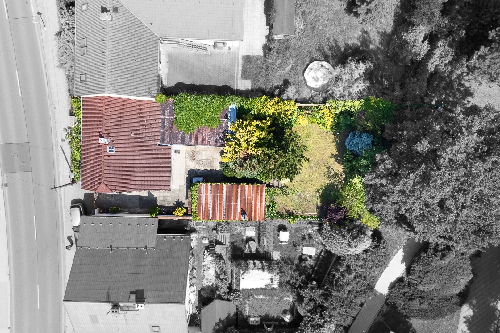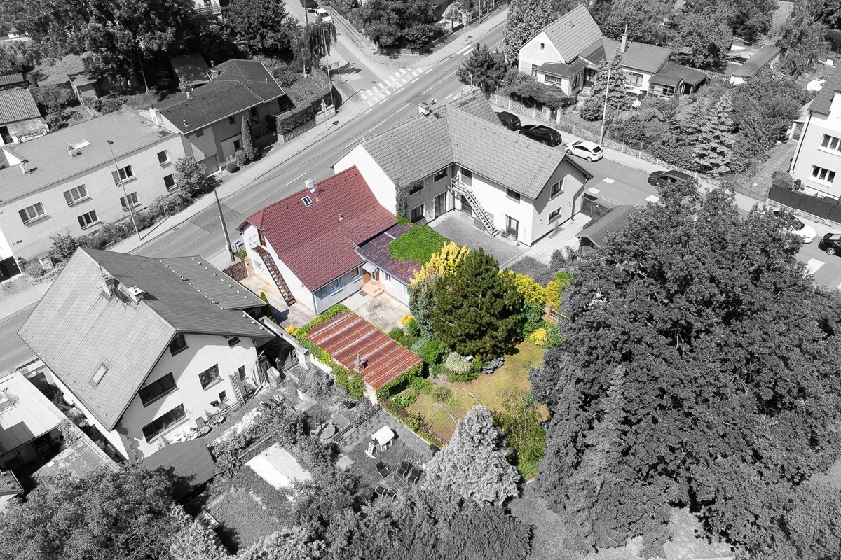 Dům stojí na rohovém pozemku s celkovou plochou 509 m², což zahrnuje okouzlující zahradu o rozloze 236 m² s pergolou a místo pro relaxaci, která je obklopena pečlivě udržovanými zelenými plochami a poskytuje dostatek soukromí. K domu náleží také garáž o velikosti 25 m² a další dvě parkovací stání na pozemku.