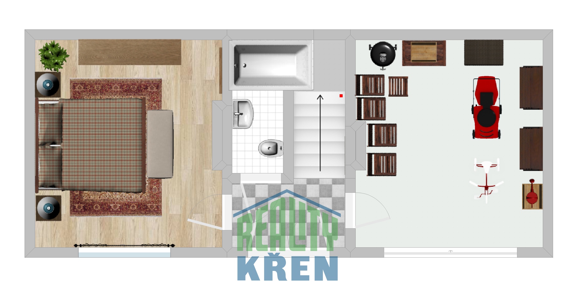 2. NP (43 m2): 2x pokoj, malá kuchyň;