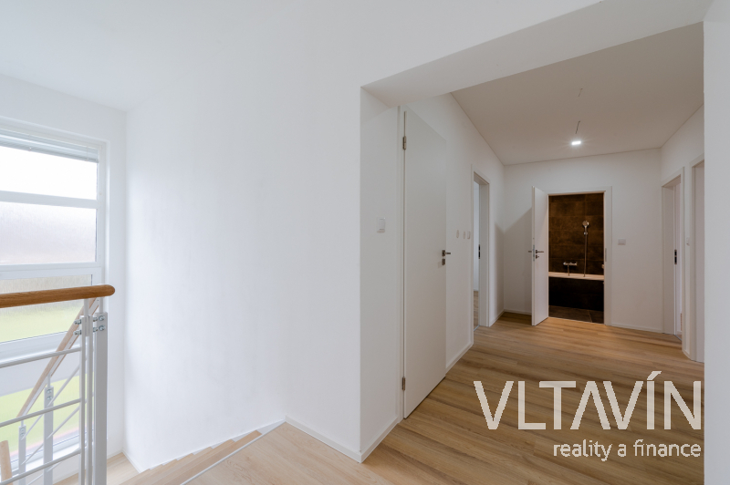 Po nadčasovém schodišti s nášlapy z dřevěného masivu se dostaneme do 1. patra, kde jsou tři ložnice z toho dvě s možností užívání lodžie, prostor pro pracovnu a koupelna se sprchovým koutem a toaletou.