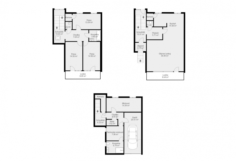 V suterénu domu se nachází místnost, která může být využita jako hobby prostor, fitness či pokoj, koupelna se sprchovým koutem a toaletou, skladový prostor, technická místnost a garáž.
