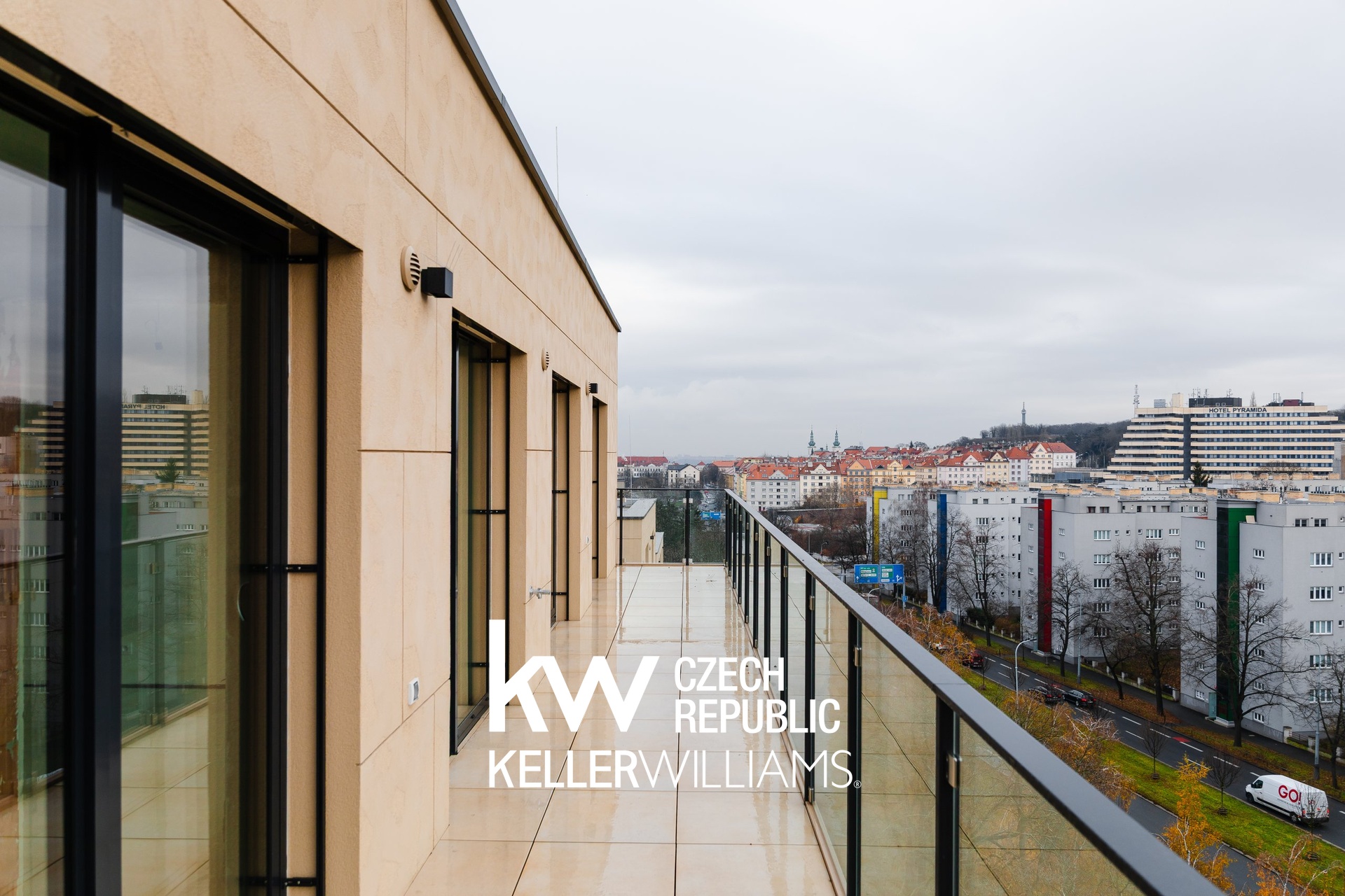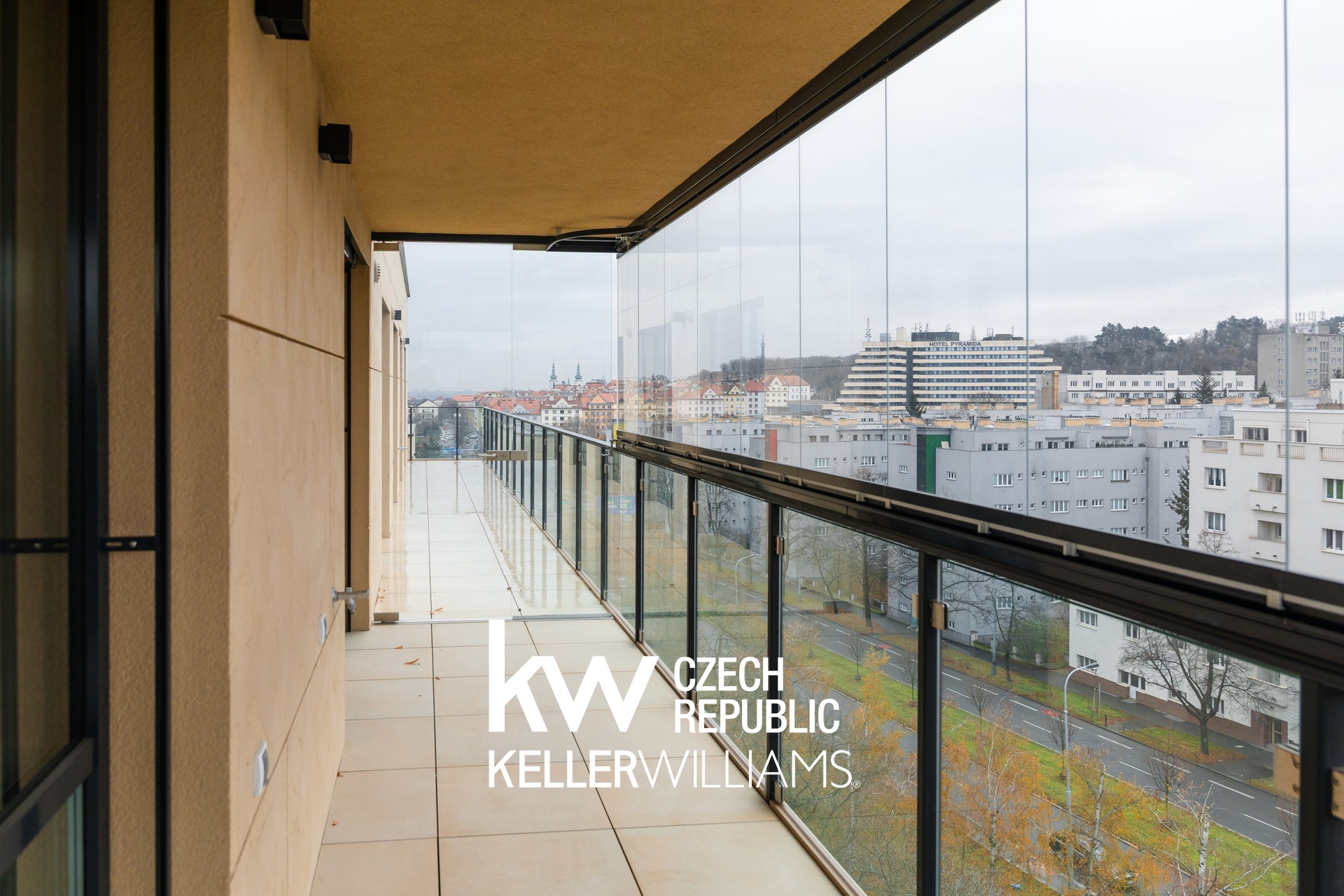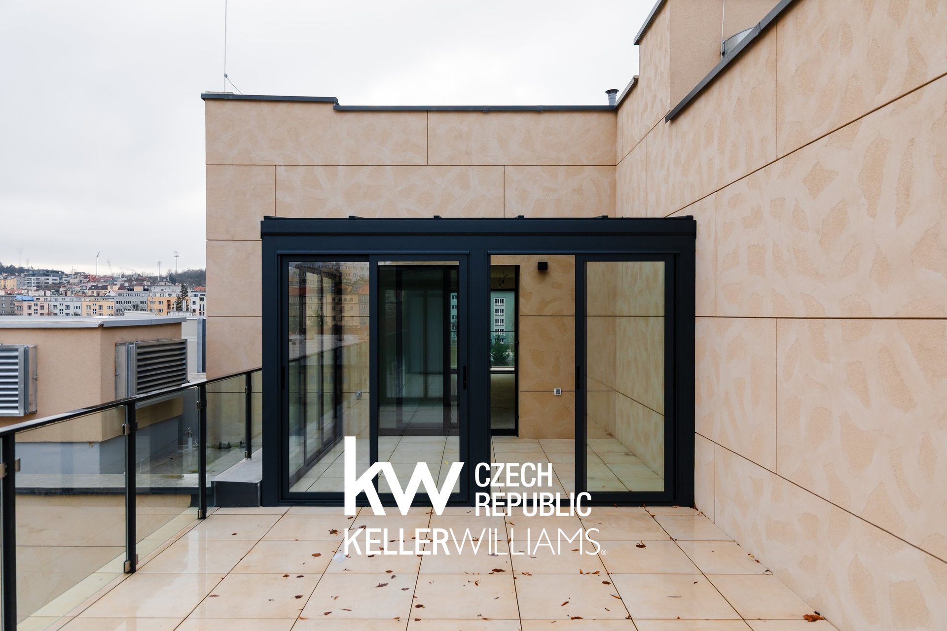 - balkony/terasy – keramická dlažba 60×60 cm na terčích, skleněná rámová zábradlí