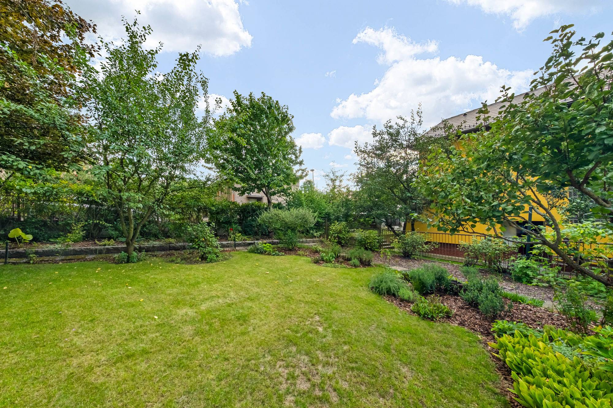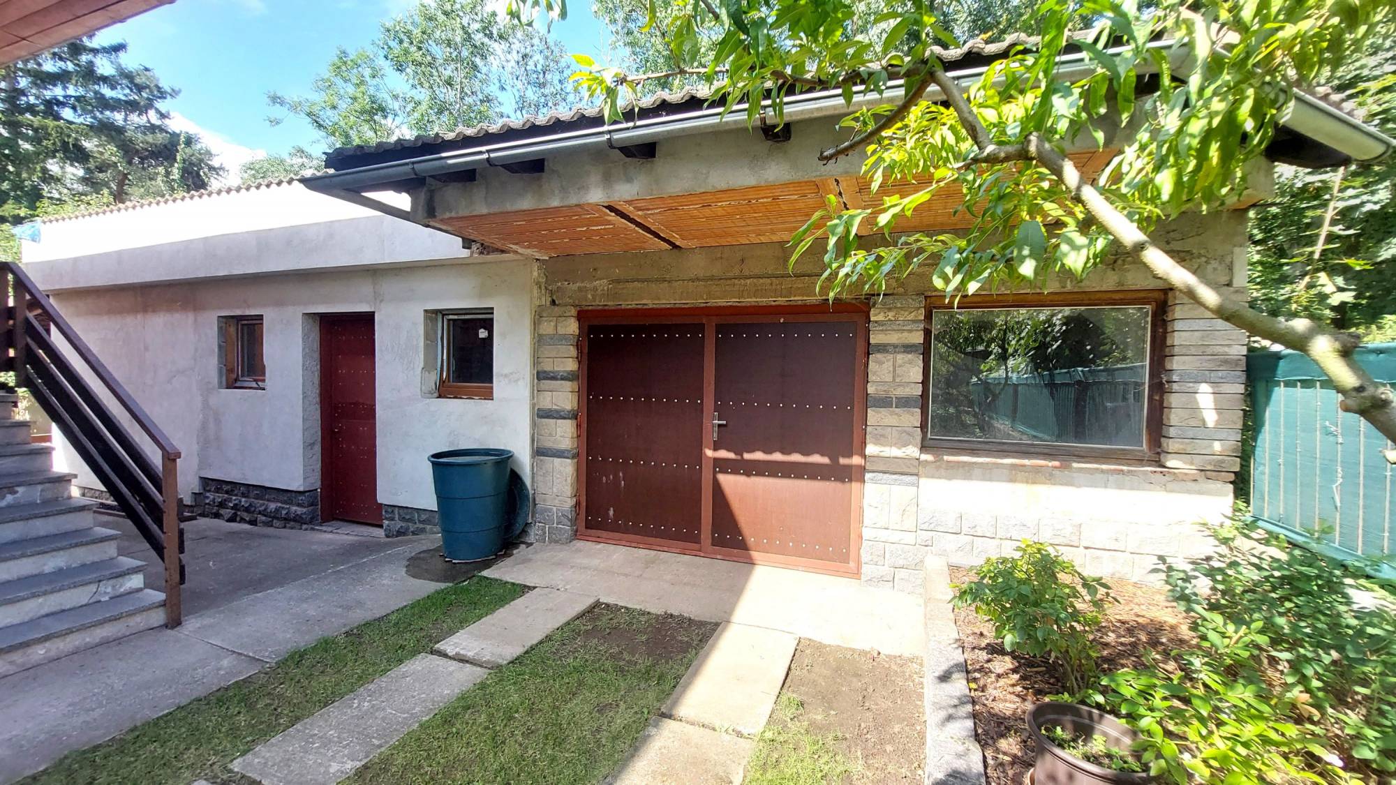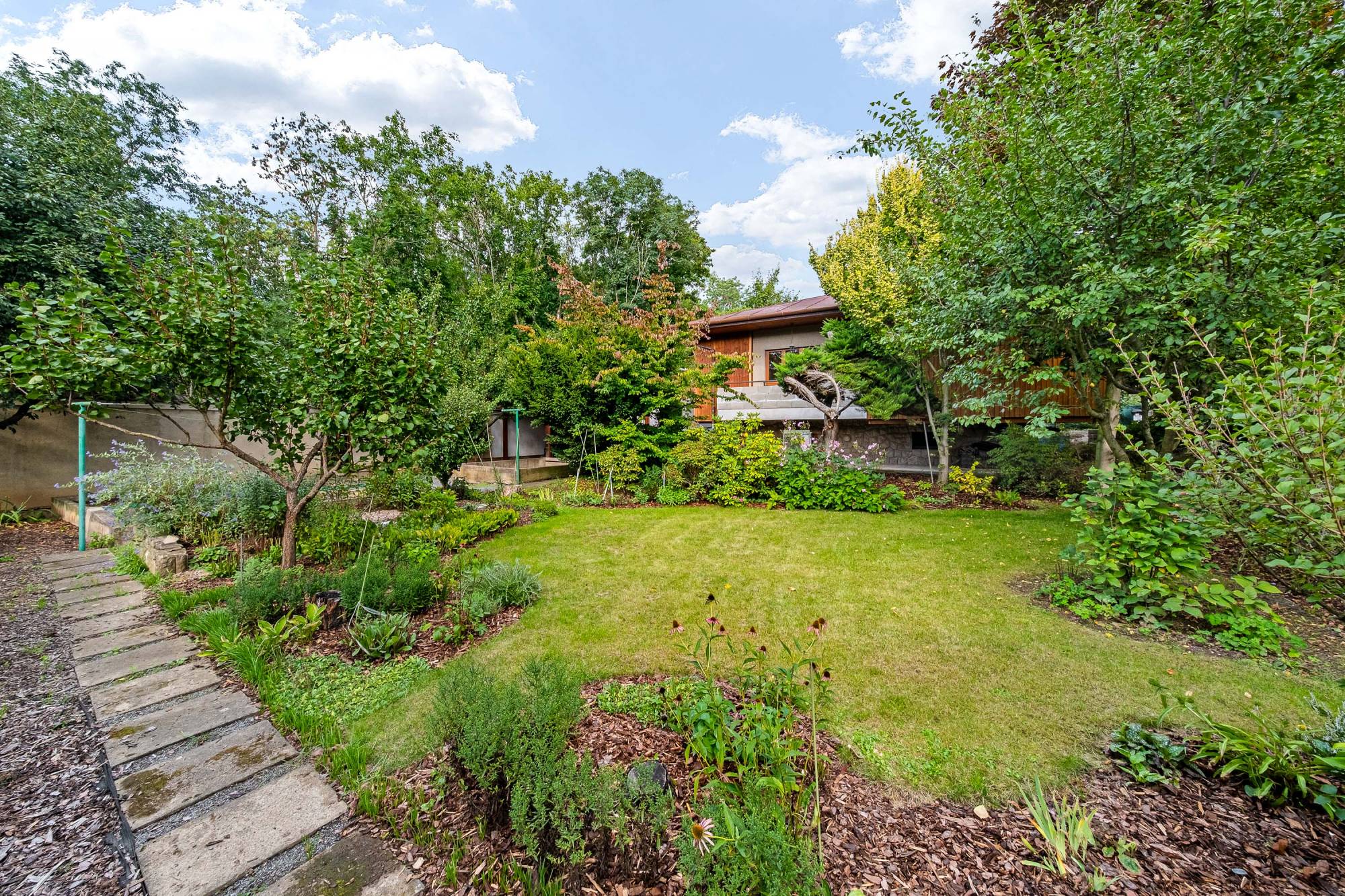 Zahradu s okrasnými a ovocnými dřevinami i dům od lesního pozemku odděluje vysoký zděný plot s brankou a přístupem na lesní pozemek.