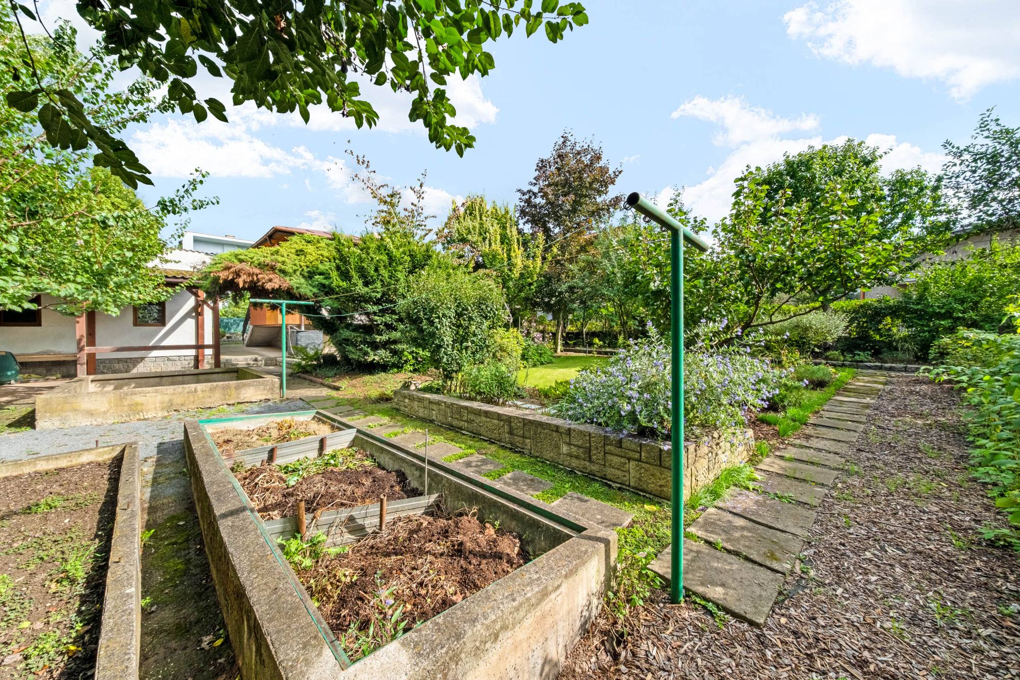 Rozlehlý pozemek a umístění domu s přístavbou na pozemku dává možnost dalšího využití, přestavby domu.