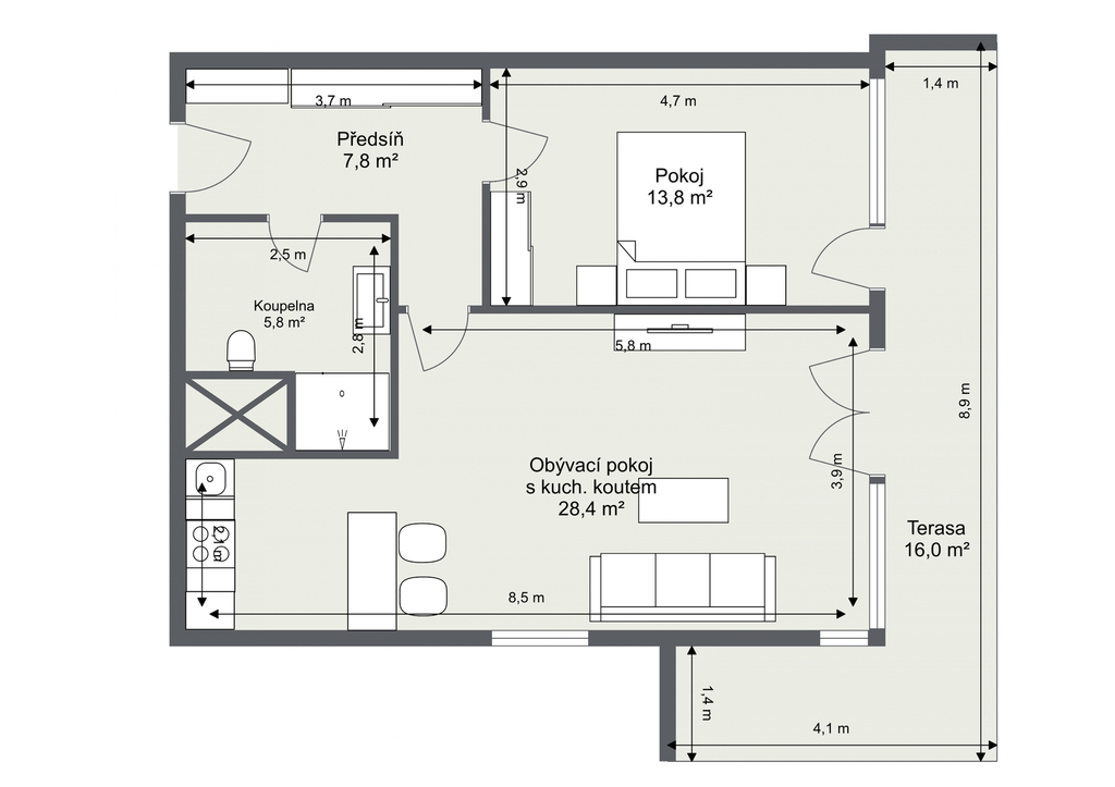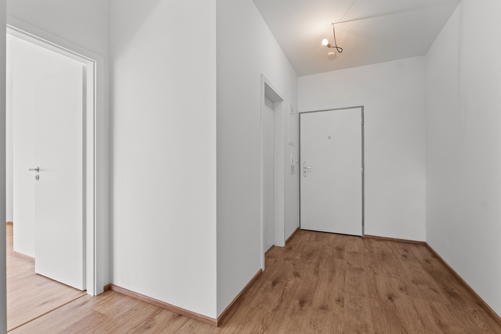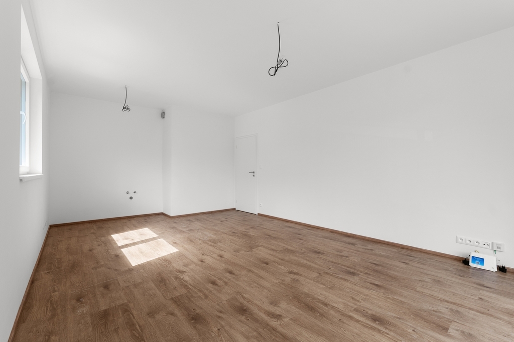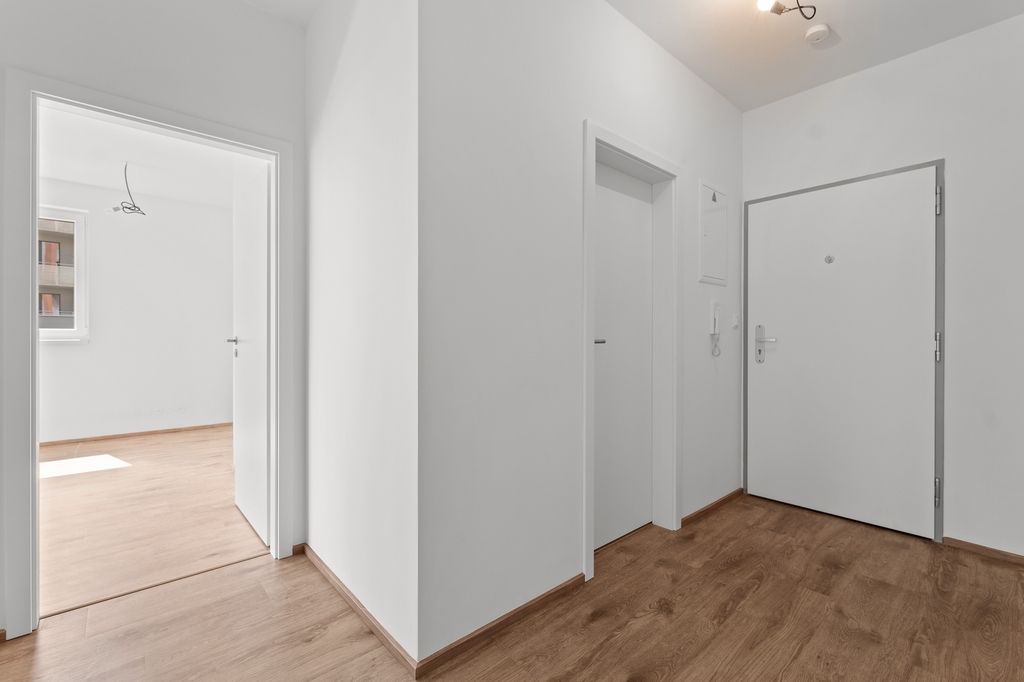 Dispozici bytu si prohlédněte na přiloženém půdorysu. Byt zahrnuje předsíň s prostorem na vestavěnou skříň, pokoj s přípravou na kuchyň se vstupem na balkon (dovolil jsem si navrhnout vizualizaci obývacíiho pokoje, fotografie s vizualizacemi jsou označeny nápisem VIZUALIZACE). Samostatný pokoj se vstupem na prostornou terasu, koupelnu se sprchovým koutem, toaletou a přípravou na pračku. Podlahy tvoří kombinace dlažby a vinilu, okna jsou orientována jih a východ. Byt je připravený k okamžitému nastěhování. K bytu náleží prostorná uzaviratelná garáž 24 m², která splní roli garáže a zároveň nabízí další úložný prostor (policová skříň apod.). Prodávající si u developera zajistil kvalitnější vybavení bytu (koupelna, sanitarní výbava, obklady, podlahy), což navýšilo cenu o cca 480.000,-Kč.