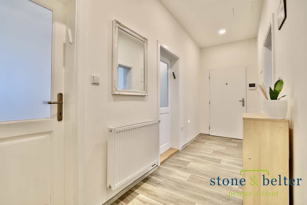 Do bytu přicházíte prostornou vstupní chodbou. Naleznete zde obývací pokoj s kuchyňským koutem a vstupem na balkon, dvě ložnice orientované do klidného vnitrobloku (jedna využívána jako pracovna s hostinským pokojem, druhá s komorou). A zajisté oceníte koupelnu se sprchovým koutem, samostatnou toaletu, spíž, komoru a sklepní kóji (4 m²).