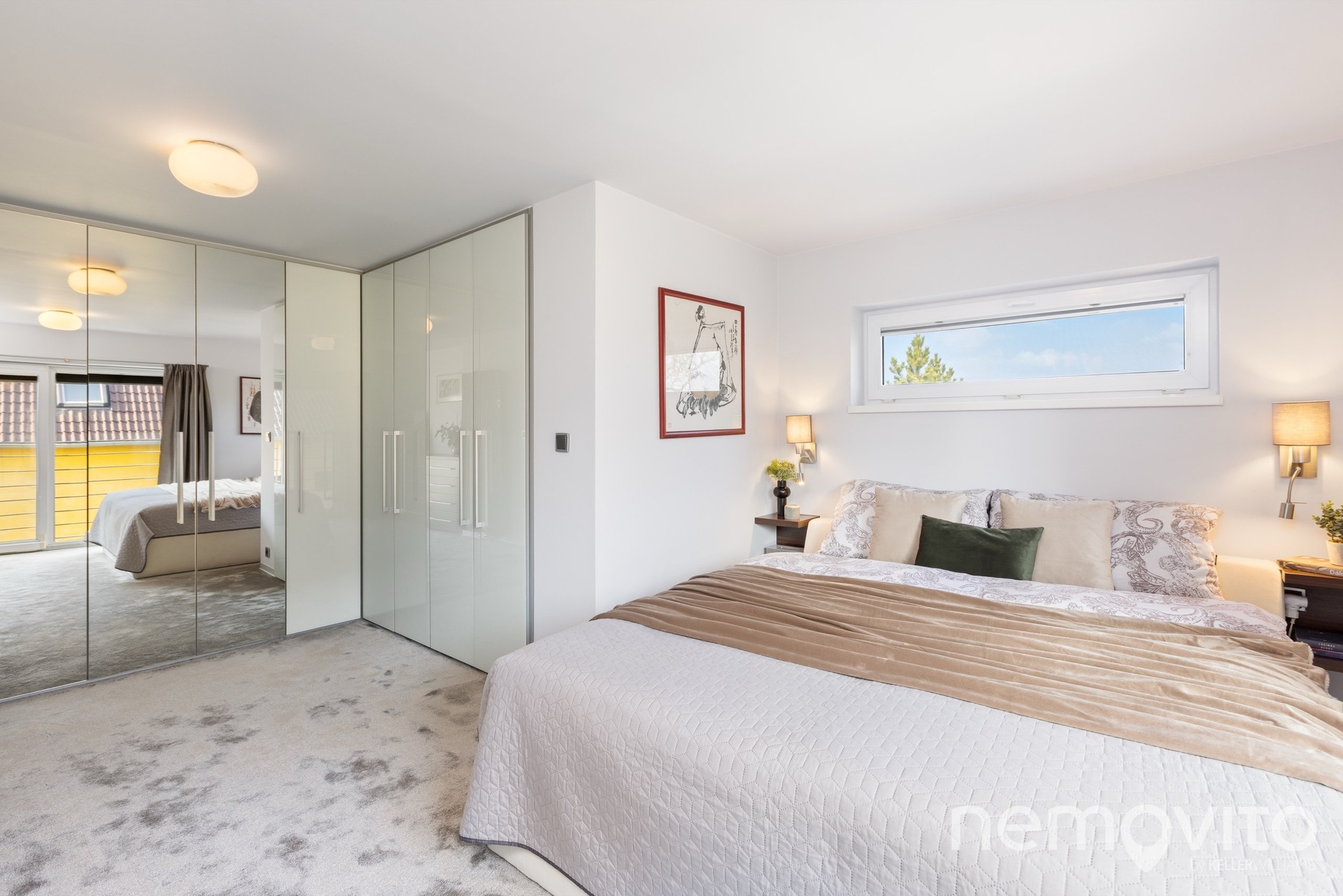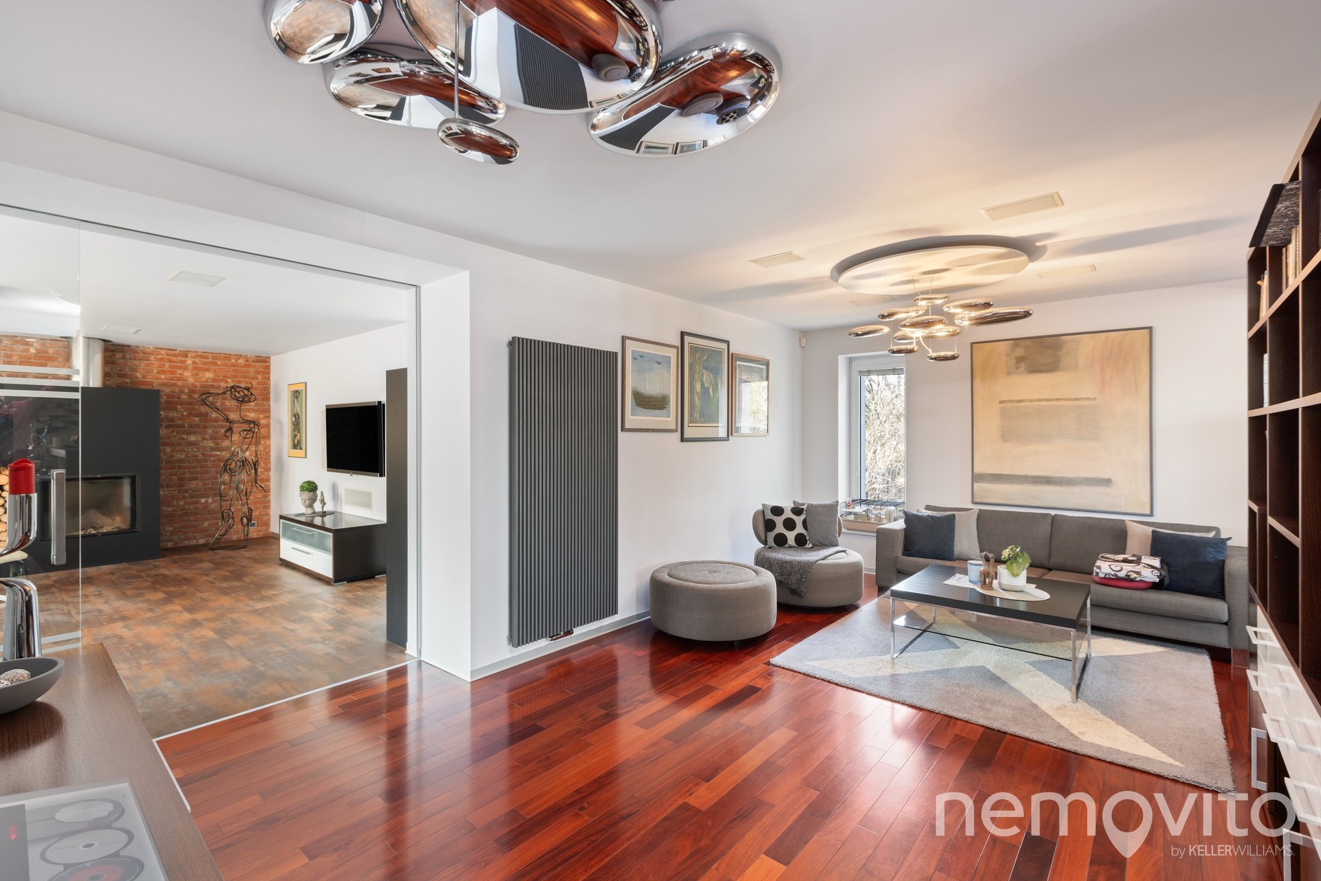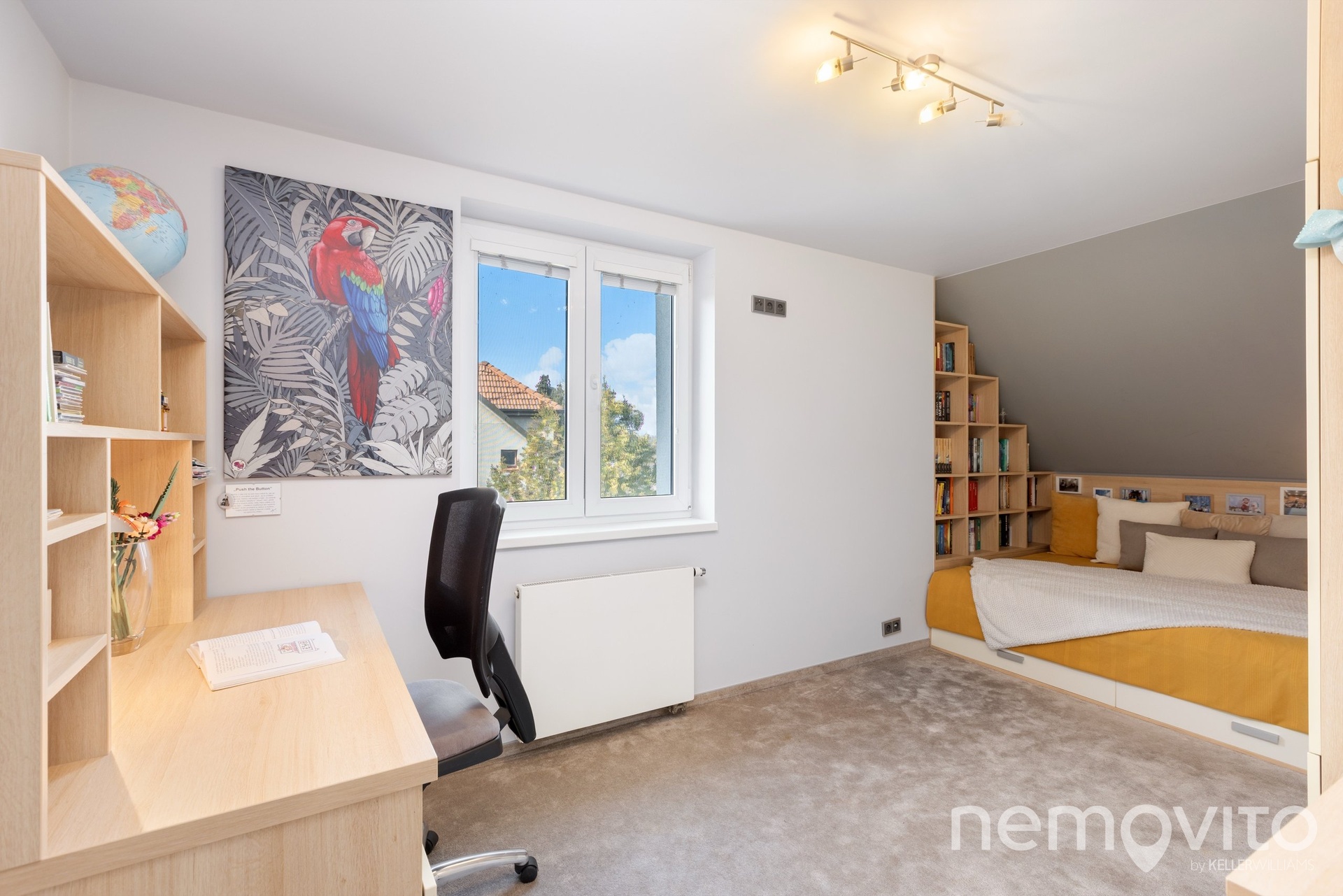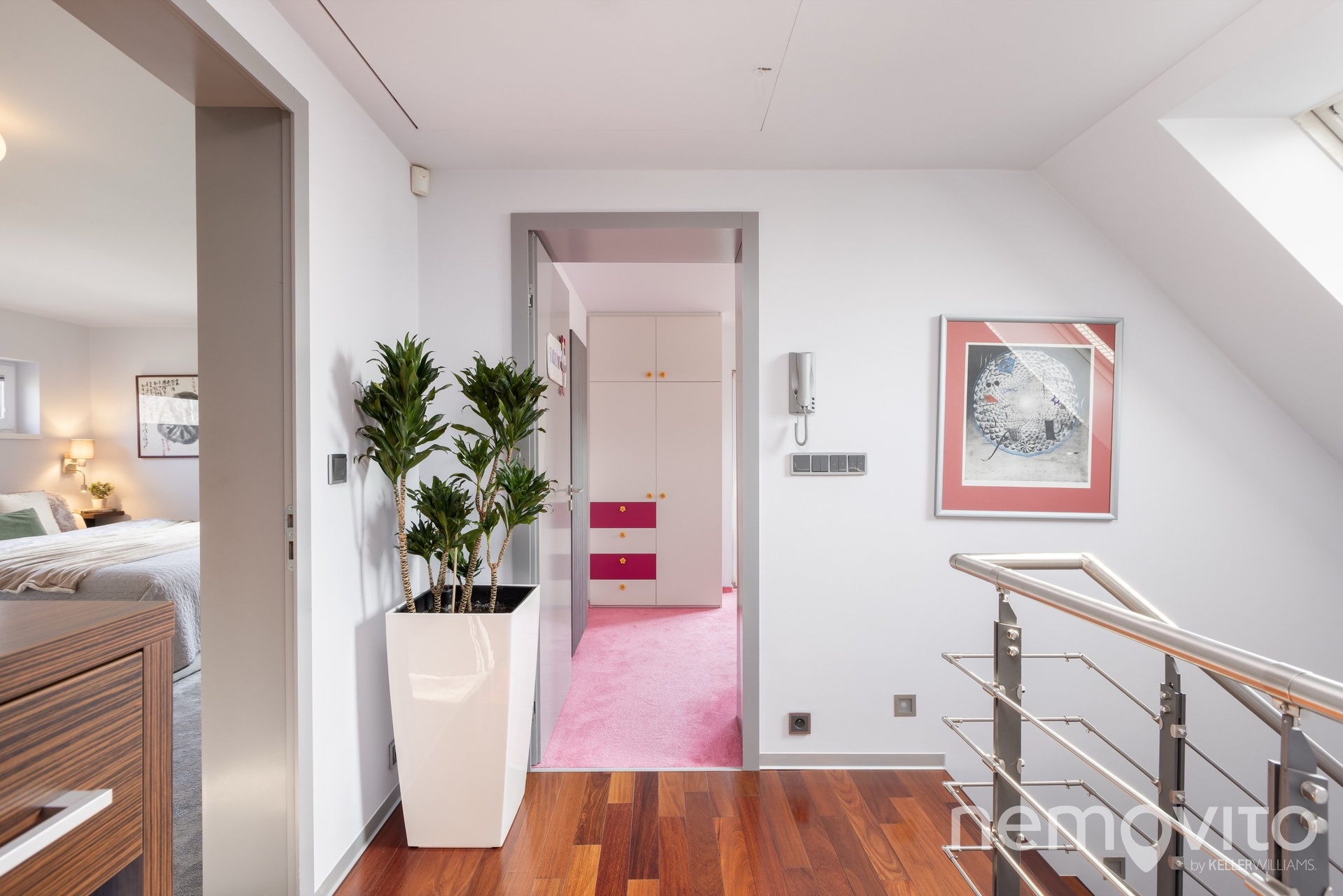 Hlavní částí domu jsou dva na sebe navazující obývací pokoje a jídelna s kuchyní. Na podlaze je kvalitní exotické dřevo, v prvním pokoj s velkou prosklenou stěnou krb, a kuchyňské lince byste s ohledem na stav a provedení jen stěží hádali její věk. V prvním podlaží nechybí také koupelna a prostorná vstupní chodba. Všechny ložnice jsou pak nahoře. Ty jsou celkem 4, přičemž k té hlavní náleží ještě velká šatna. Koupelna je od WC oddělená a vyniká velkou mírou světla díky 4 střešním oknům.