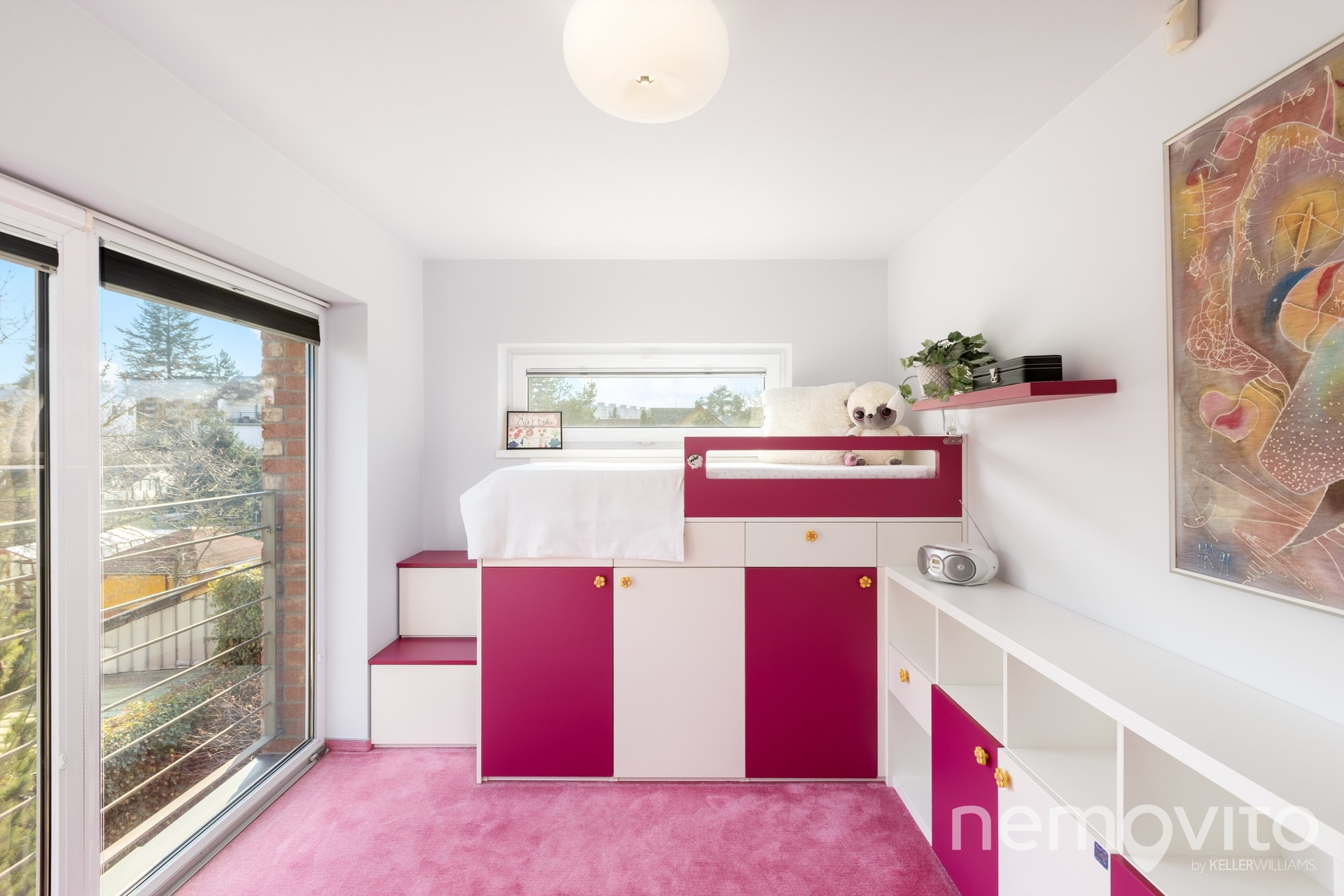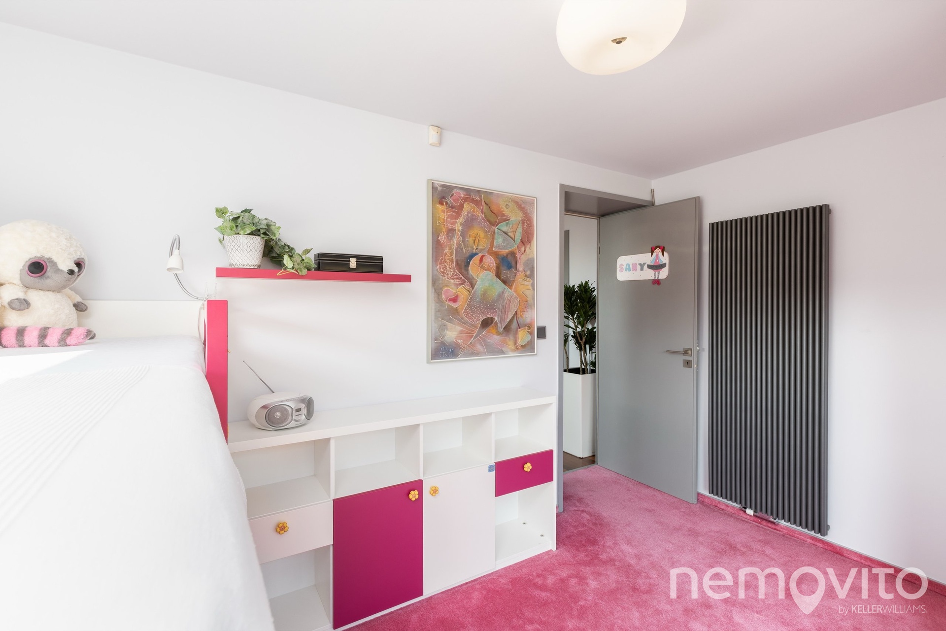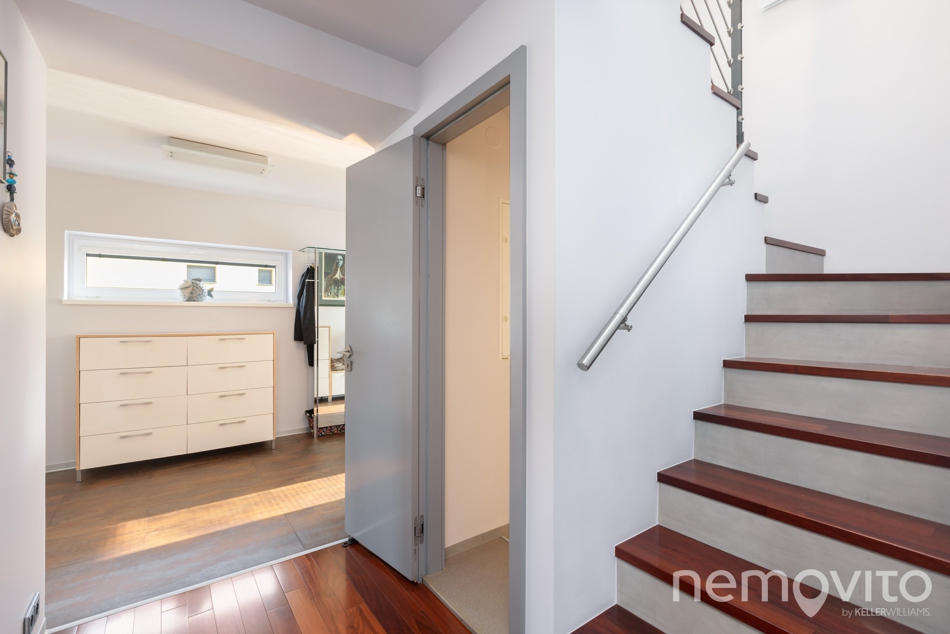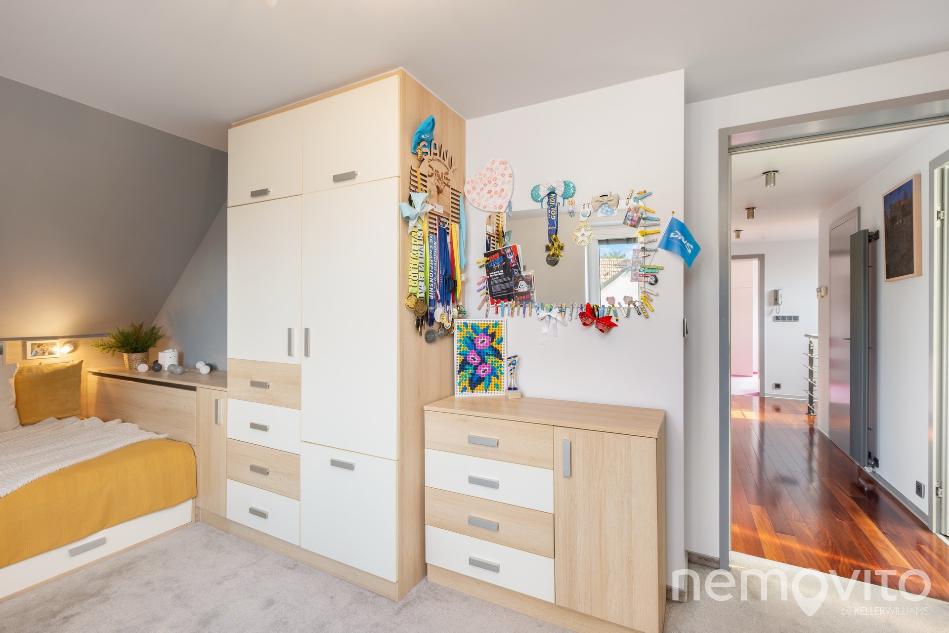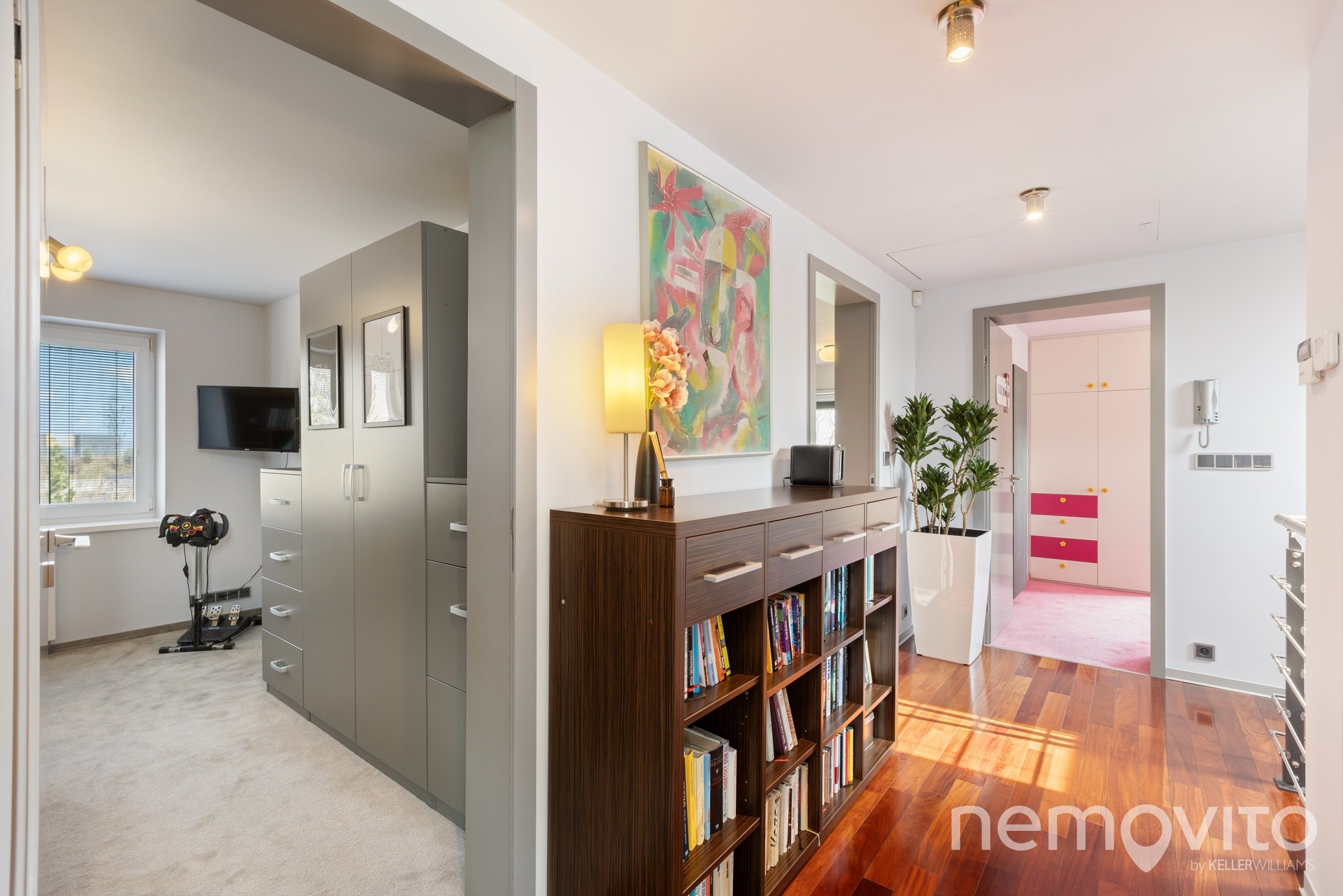 Hlavní částí domu jsou dva na sebe navazující obývací pokoje a jídelna s kuchyní. Na podlaze je kvalitní exotické dřevo, v prvním pokoj s velkou prosklenou stěnou krb, a kuchyňské lince byste s ohledem na stav a provedení jen stěží hádali její věk. V prvním podlaží nechybí také koupelna a prostorná vstupní chodba. Všechny ložnice jsou pak nahoře. Ty jsou celkem 4, přičemž k té hlavní náleží ještě velká šatna. Koupelna je od WC oddělená a vyniká velkou mírou světla díky 4 střešním oknům.