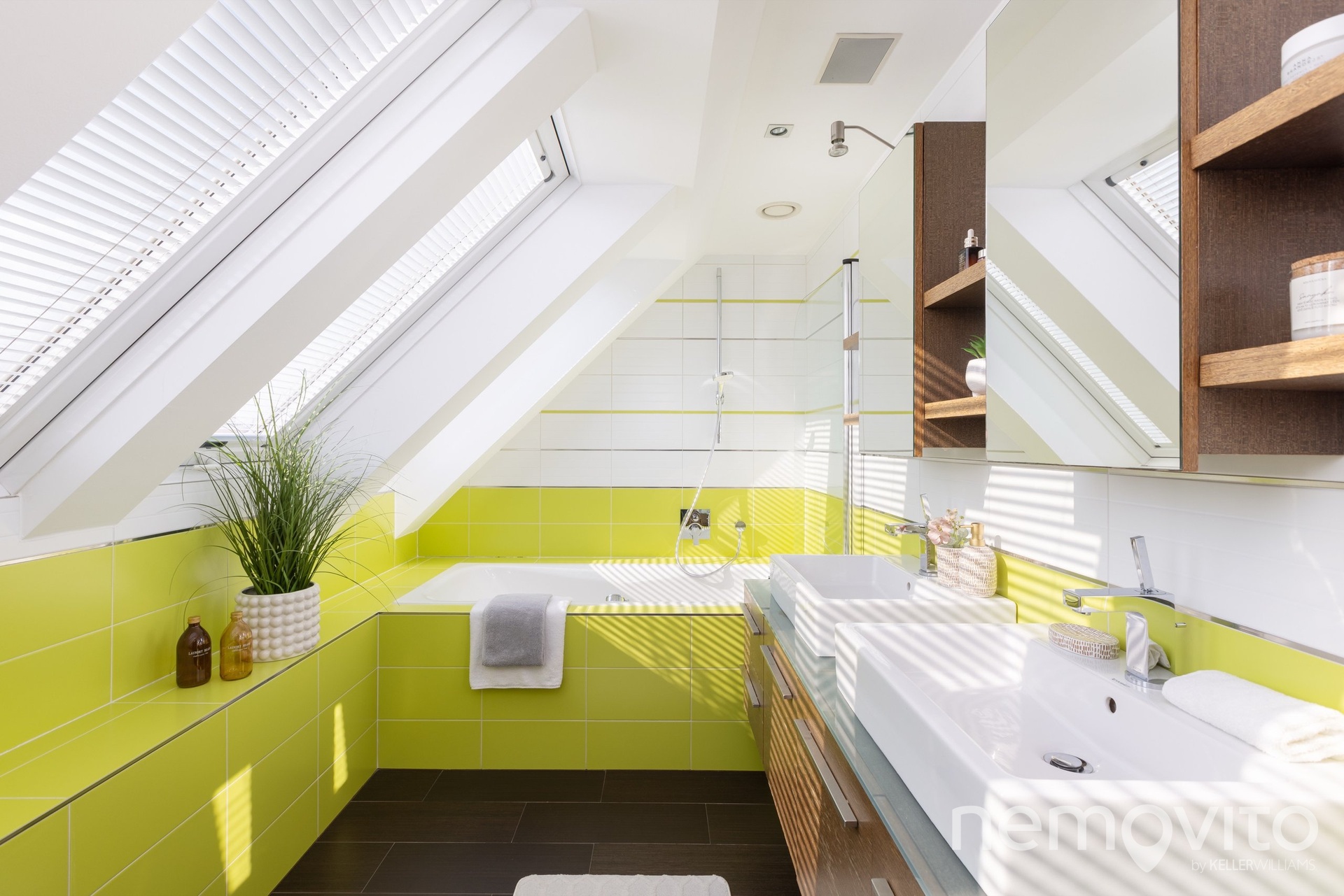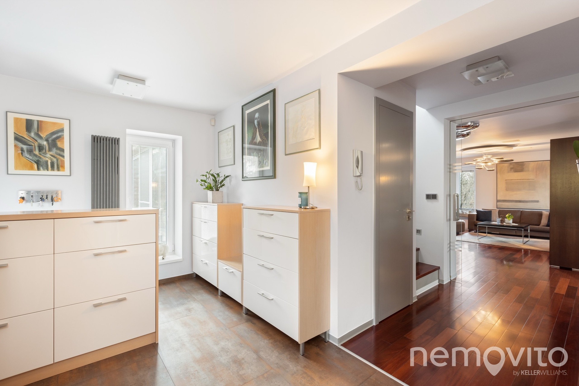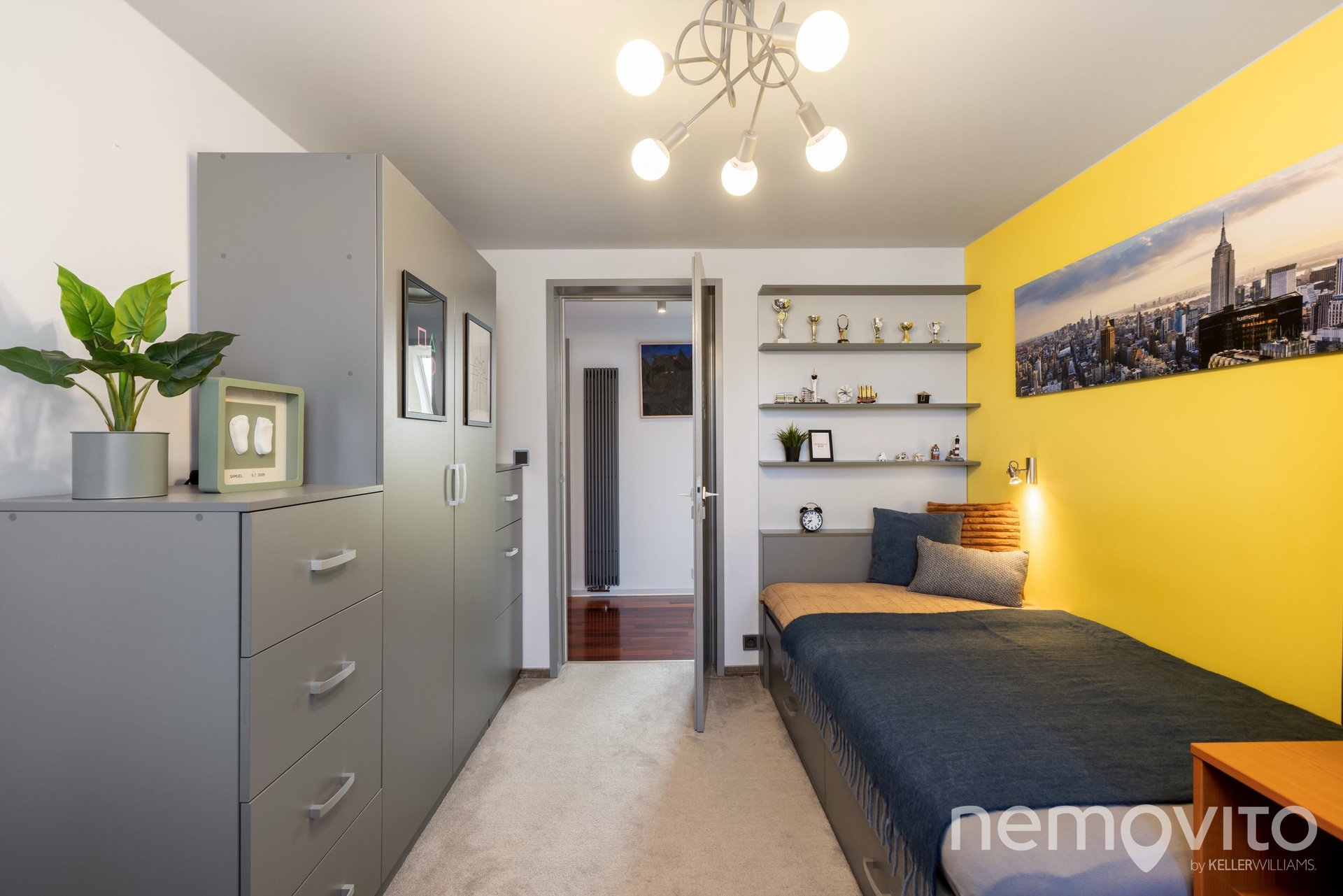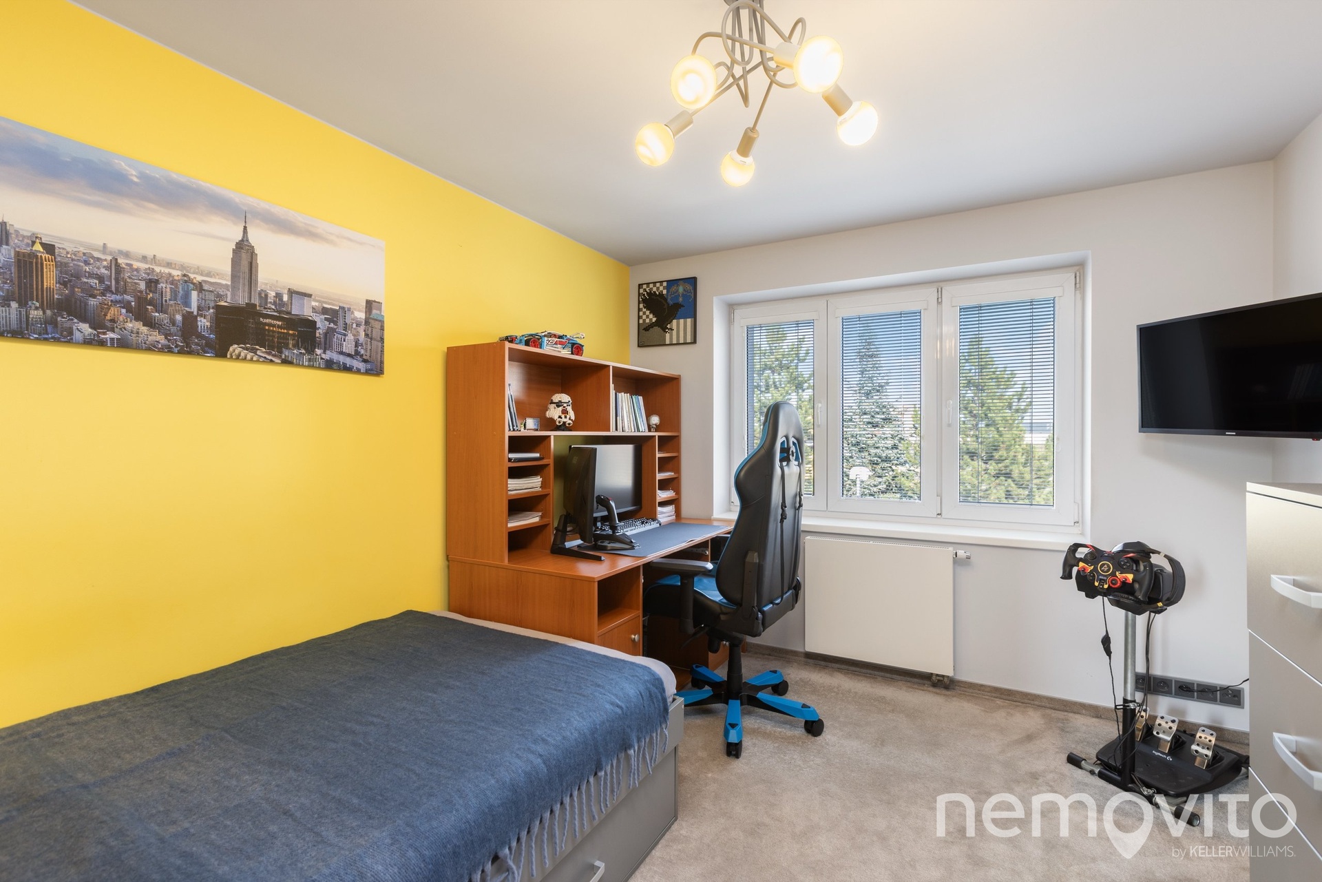 Hlavní částí domu jsou dva na sebe navazující obývací pokoje a jídelna s kuchyní. Na podlaze je kvalitní exotické dřevo, v prvním pokoj s velkou prosklenou stěnou krb, a kuchyňské lince byste s ohledem na stav a provedení jen stěží hádali její věk. V prvním podlaží nechybí také koupelna a prostorná vstupní chodba. Všechny ložnice jsou pak nahoře. Ty jsou celkem 4, přičemž k té hlavní náleží ještě velká šatna. Koupelna je od WC oddělená a vyniká velkou mírou světla díky 4 střešním oknům.