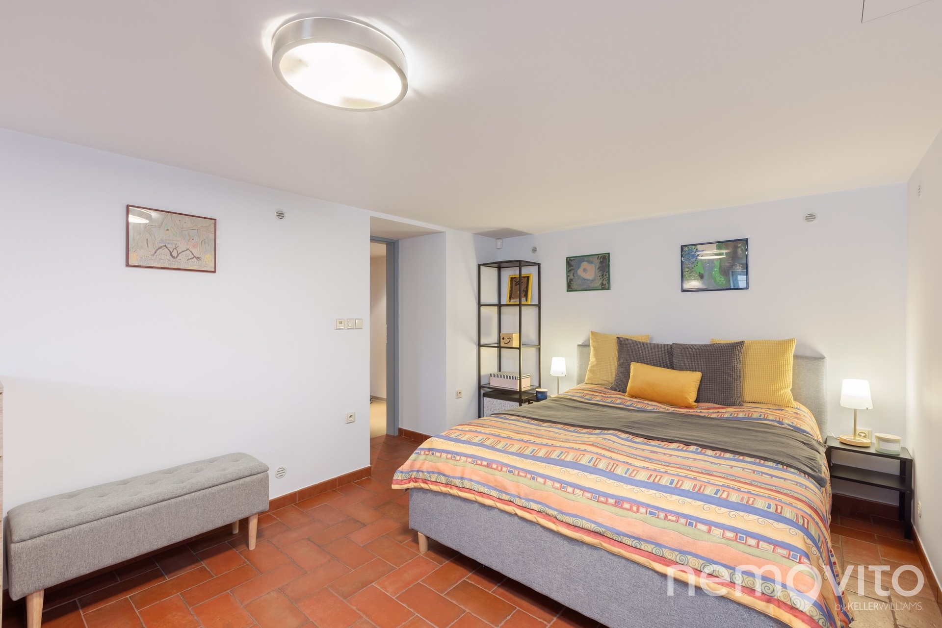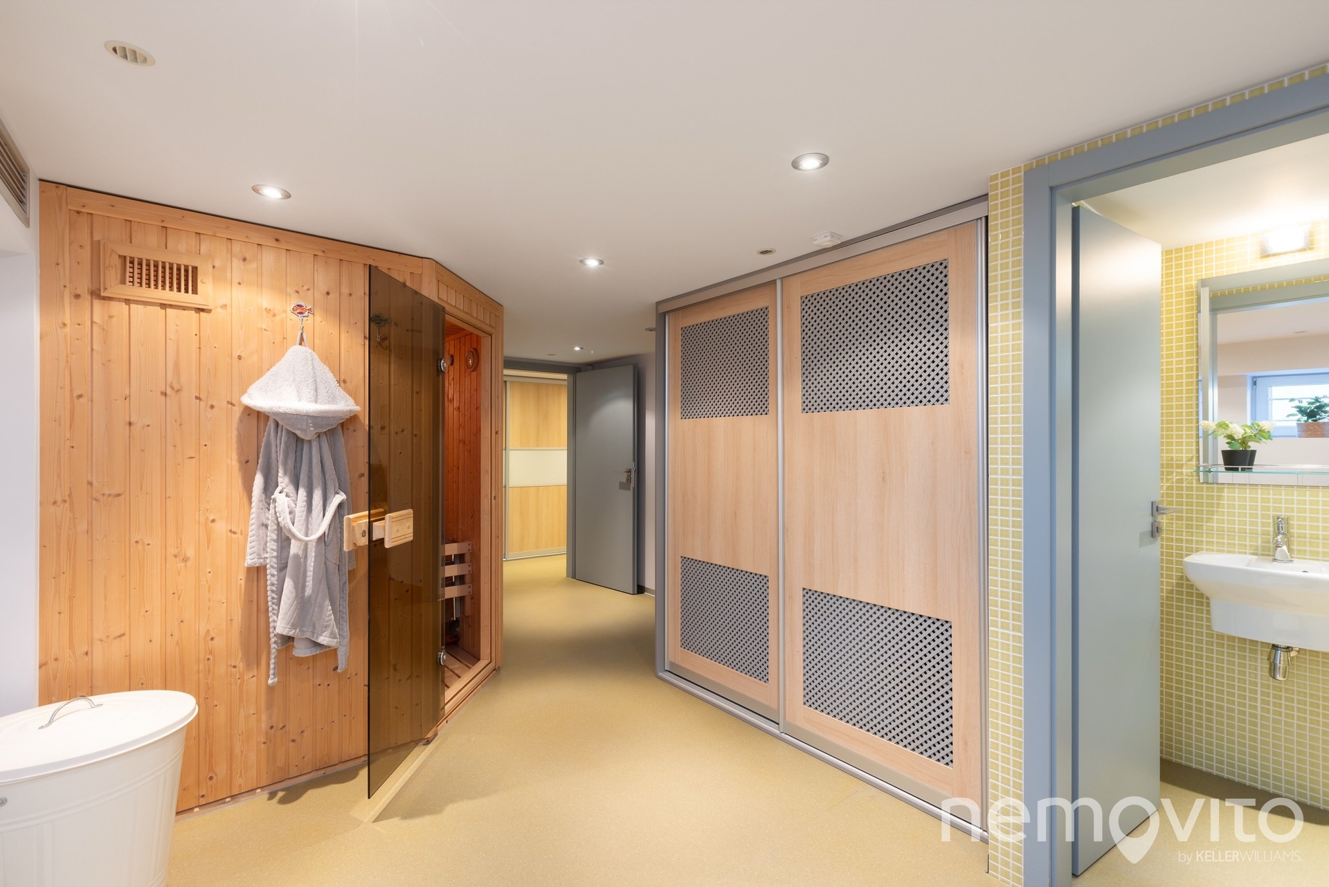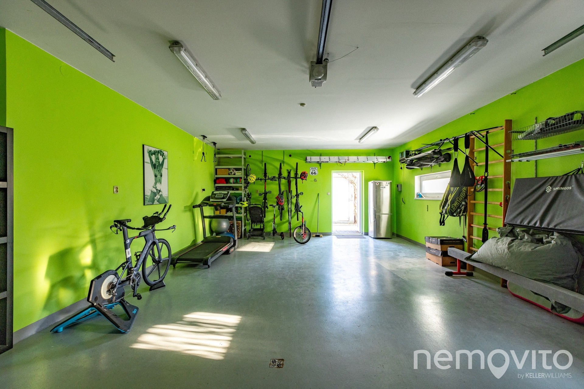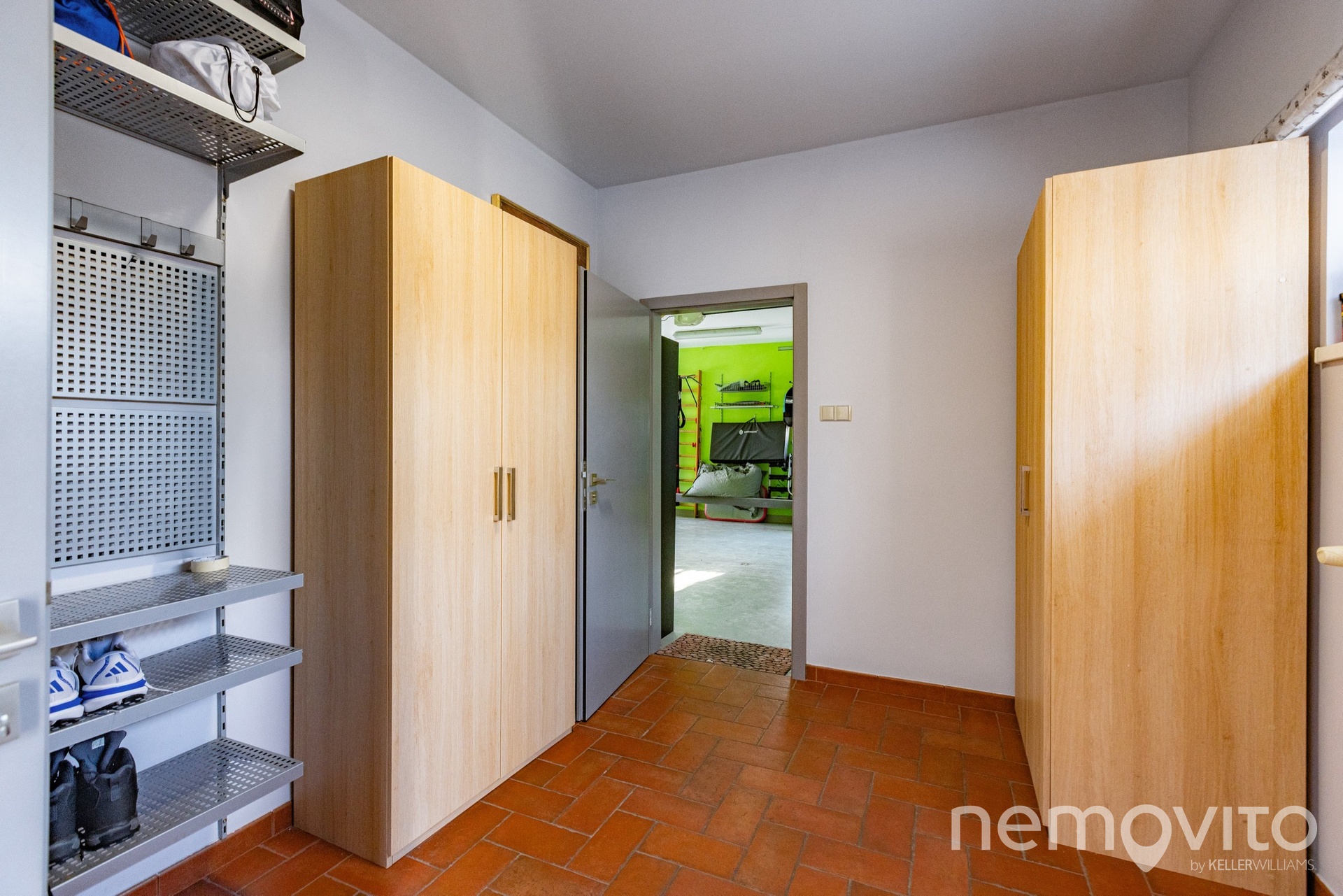 V suterénu domu je mimo spousty úložného prostoru (solo místnost jako prádelna či šatna, velká skříň na chodbě) také sauna, WC a sprcha. Ty lze využít jako zázemí k sousednímu pokoji pro hosty, který má vstup samostatně ze zadní strany domu. Na přilehlé zpevněné ploše lze bez nadsázky zaparkovat i kamion a garáž o ploše přes 50 m2 bez potíží pojme auta i motorky.
