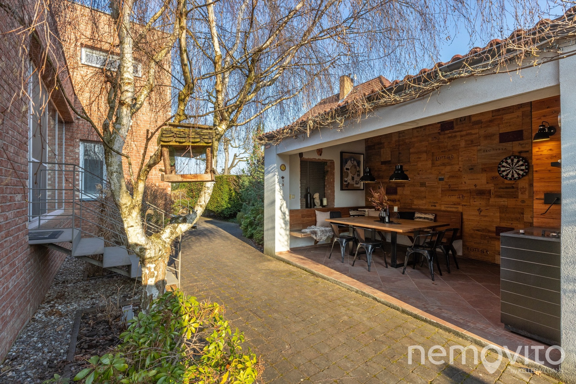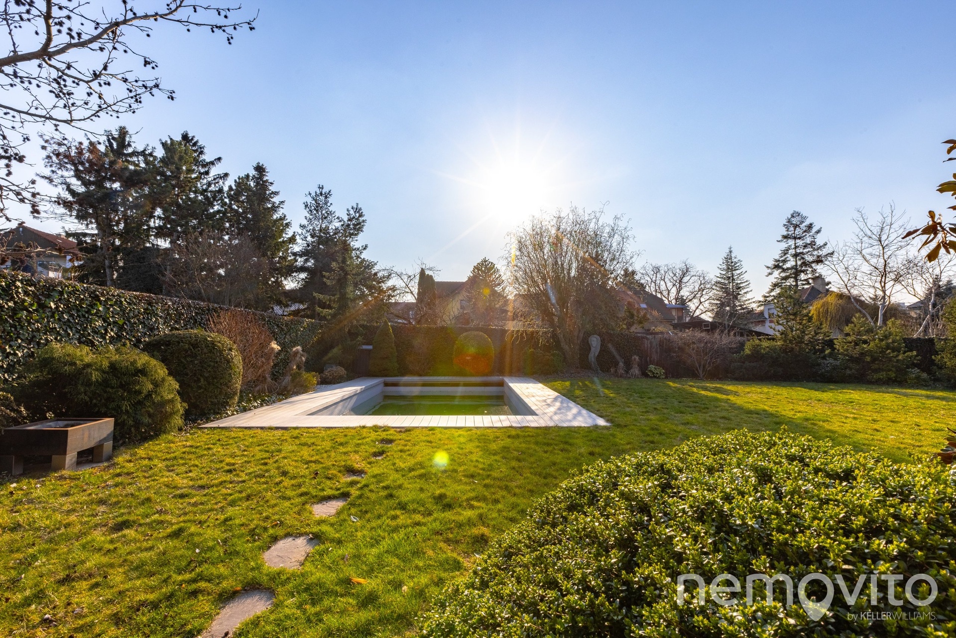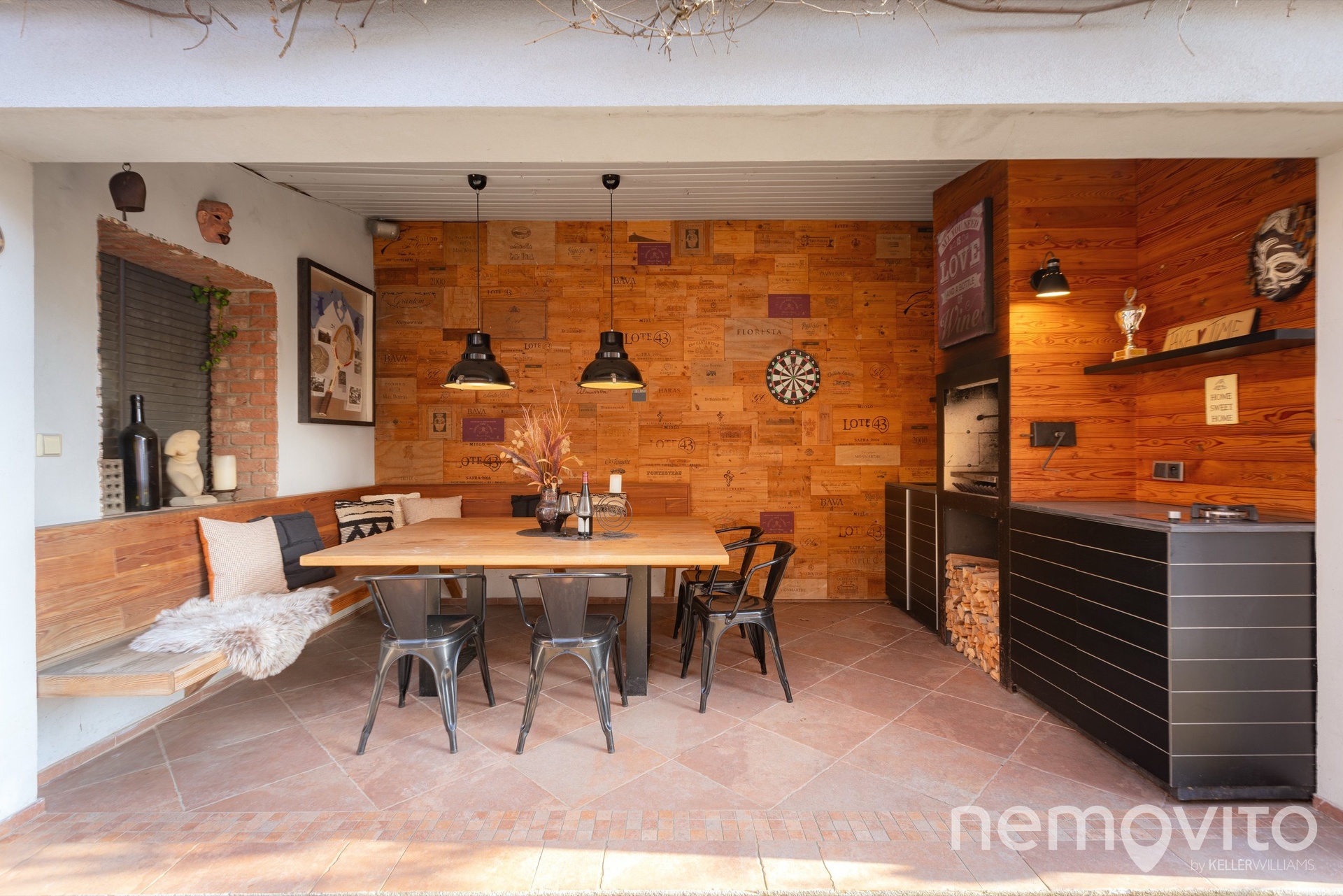 Zahrada je orientovaná na západ a k dispozici je také bazén (filtrace + výhřev). Za garáží je terasa a vedle domu pak zděný domek ke grilování, který má k dispozici letní kuchyni, a navazuje na prostor obýváku s prosklenou stěnou. Letní party pak mohou probíhat uvnitř i zvenčí, aniž by na vás kdokoliv viděl.