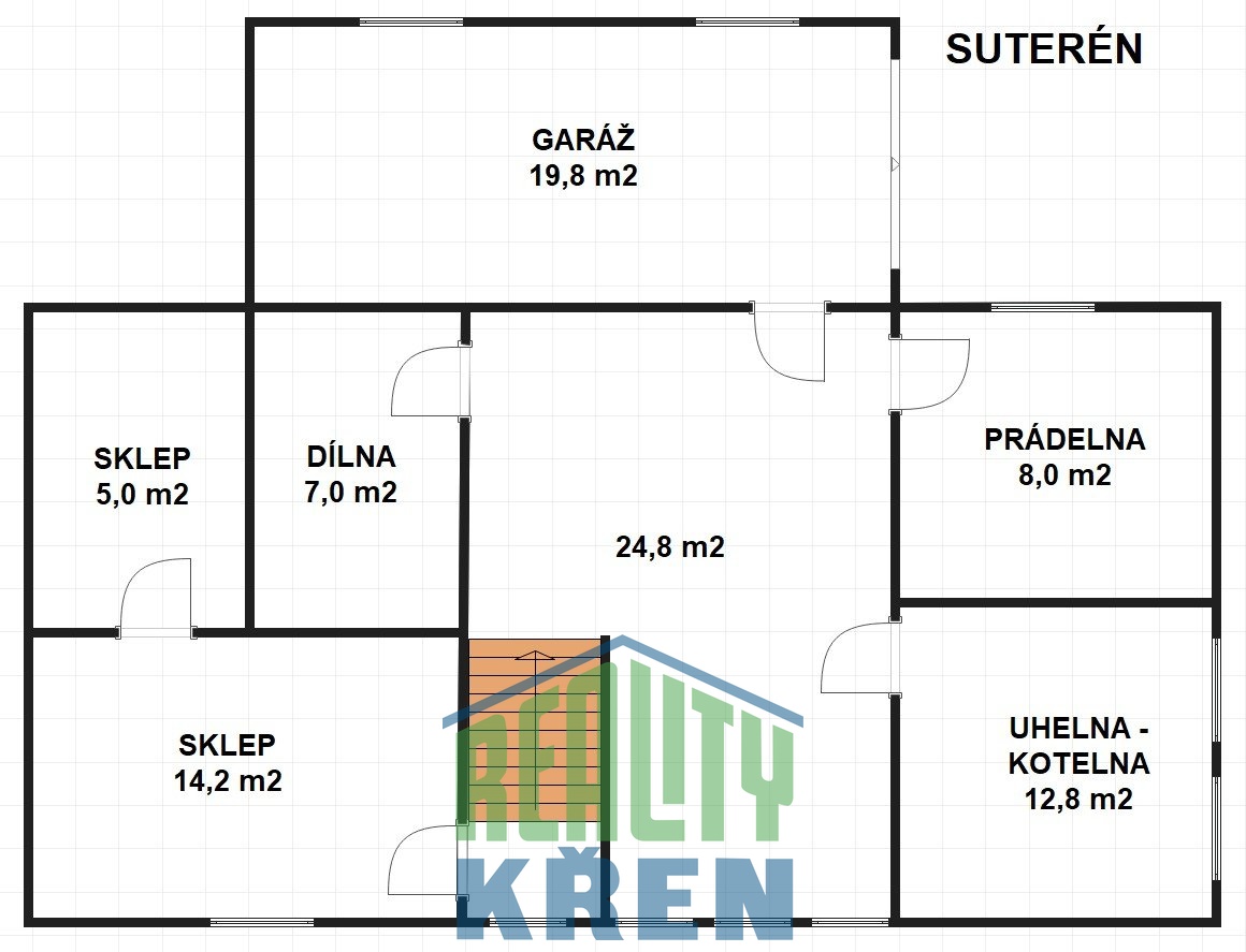 Suterén: dva sklepy, prádelna, kotelna, dílna, garáž;