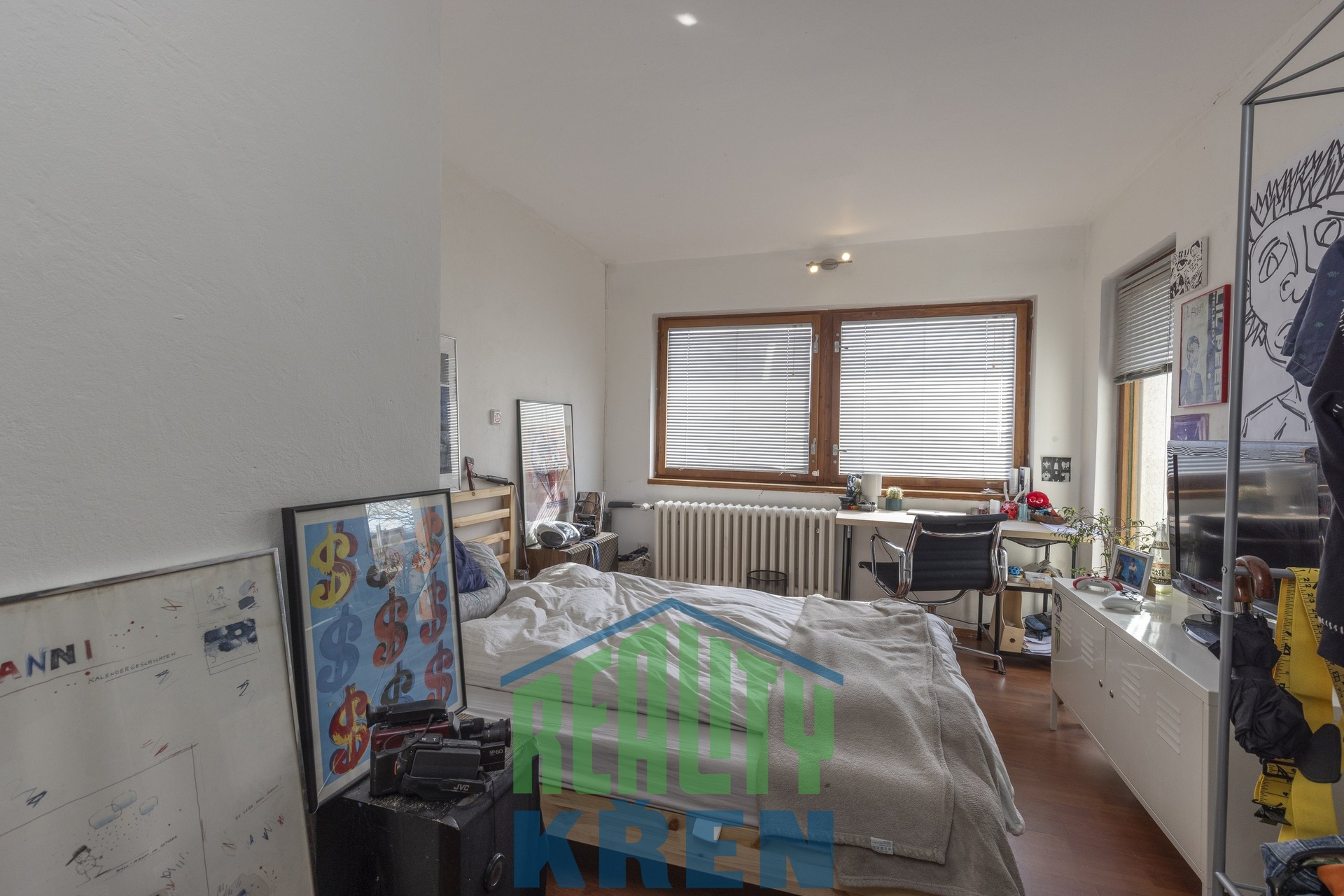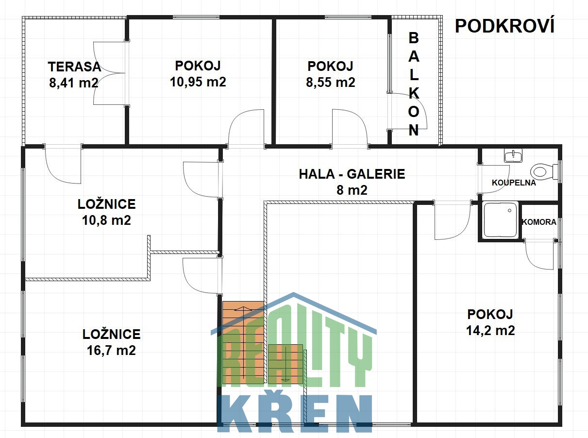 2. NP: otevřená galerie 8 m2, pět pokojů 16,7 m2, 10,8 m2, 11 m2, 8,6 m2, 16 m2, koupelna se sprchovým koutem a WC 2,5 m2, balkon 3,9 m2, terasa 7,8 m2 - z této terasy je výhled i na Pražský hrad;