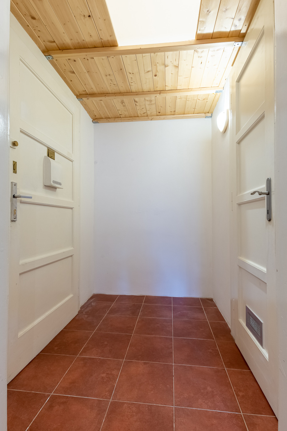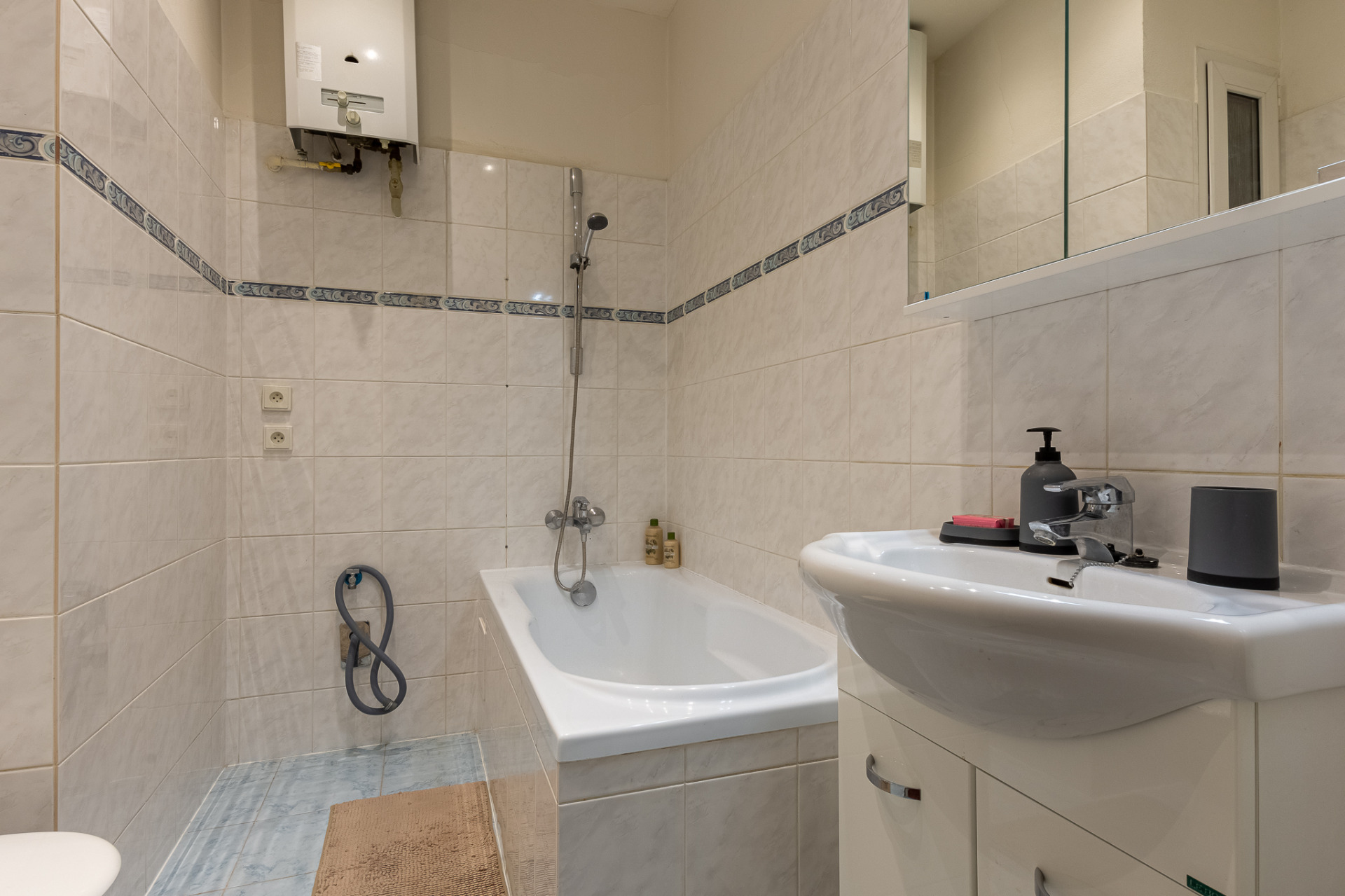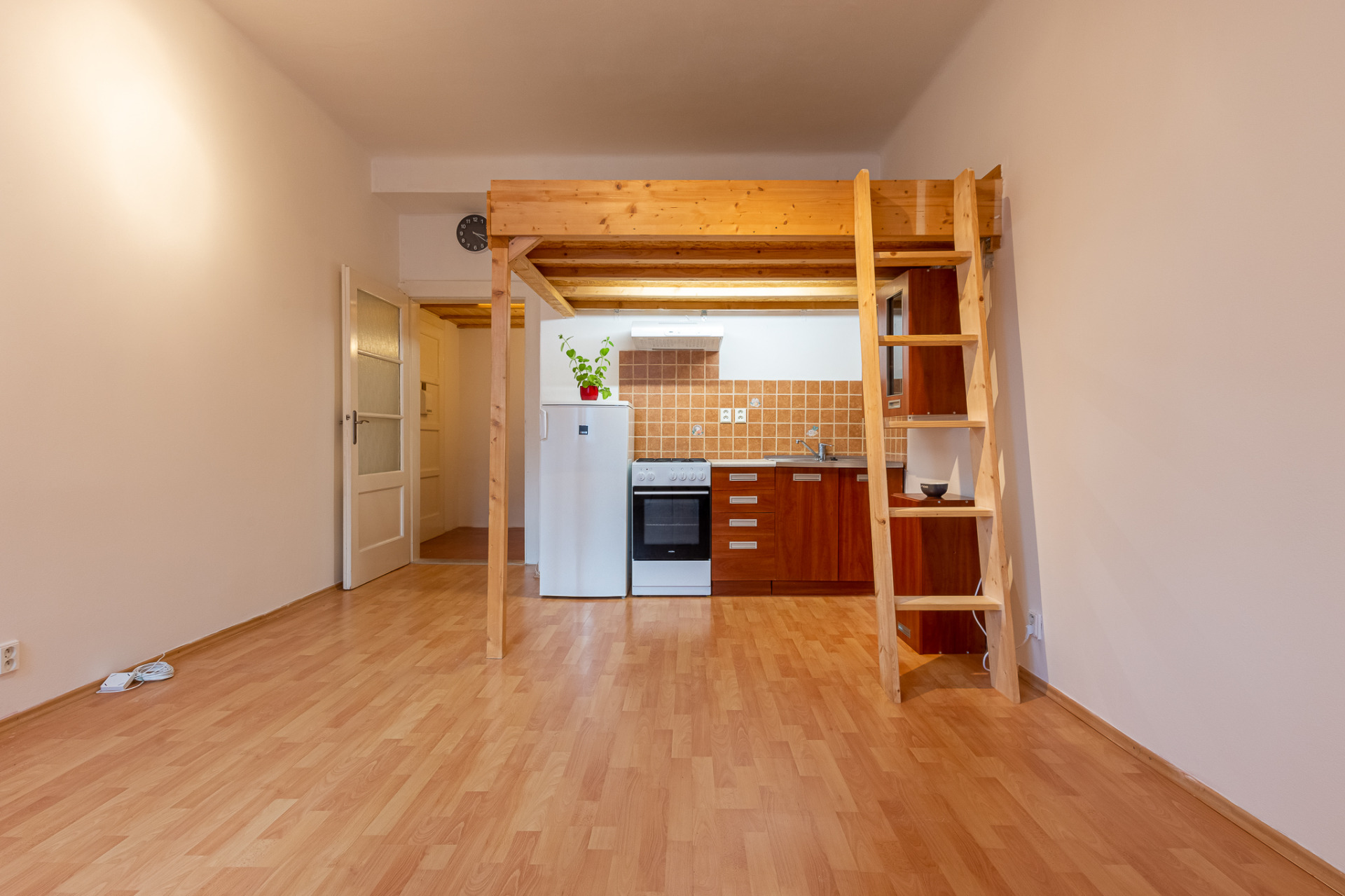 Byt se nabízí částečně vybavený. Pěkná kuchyňská linka disponuje lednicí, plynovým sporákem a digestoří. Praktické spací patro je zařízené matrací. V bytě je i prostorná úložná komora. Součástí koupelny je vana, umyvadlo a toaleta. V předsíni najdeme i úložné prostory ve stropě.
