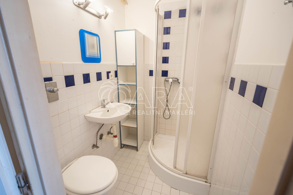 Bytový dům se nachází ve vedlejší méně frekventované ulici a je orientovaný na východ. Je v 1. patře a má 22 m2 + spací patro s úložným prostorem. Je rozdělený na obývací pokoj s kuchyňskou linkou (14 m2), koupelnu s toaletou (2,2 m2), předsíň (5 m2), komoru (0,8m2) a spací patro s úložným prostorem.