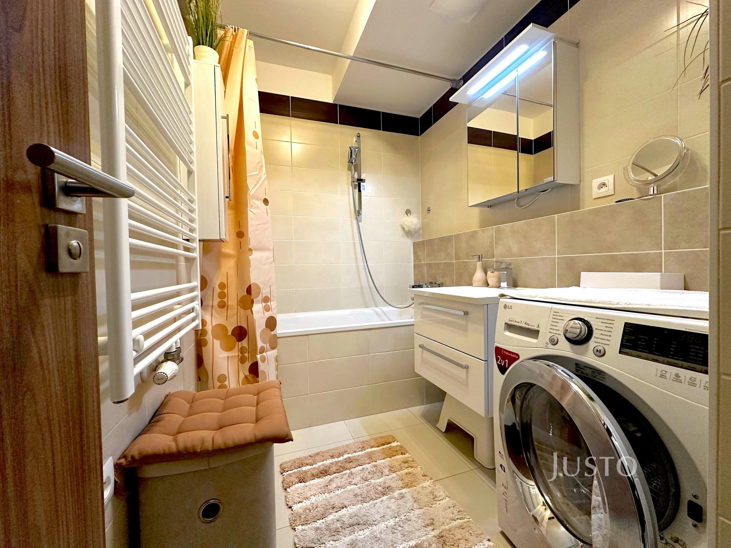 - koupelna je vybavená vanou, umyvadlem, toaletou, pračkou na prádlo kombinovanou se sušičkou