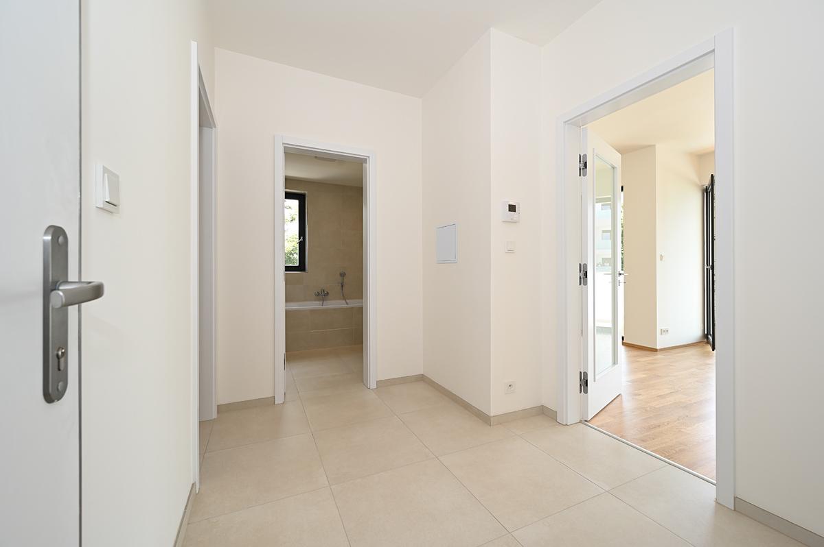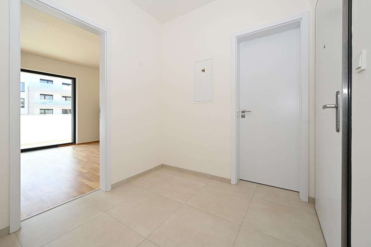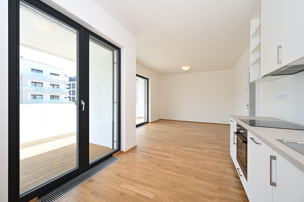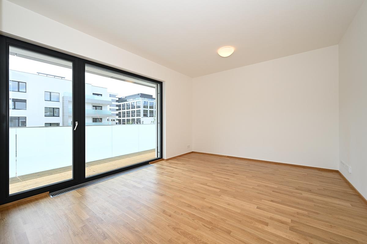 Pronájem moderního tichého bytu 2+kk 58 m2 s jihovýchodní orientací, jižní krytou terasou 12 m2, na východ orientovanou ložnicí, vše dostupné z centrální haly. Stejně tak koupelna s oddělenou toaletou.