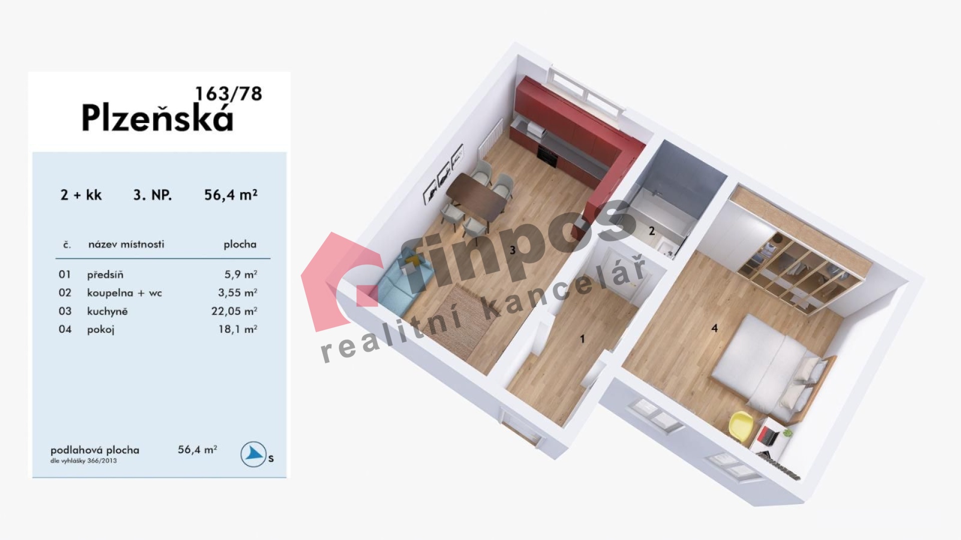 Pokud ano, tak tento byt 2+kk o velikosti 56,4 m² ve 3. podlaží cihlového domu na Plzeňské ulici je přesně pro vás.