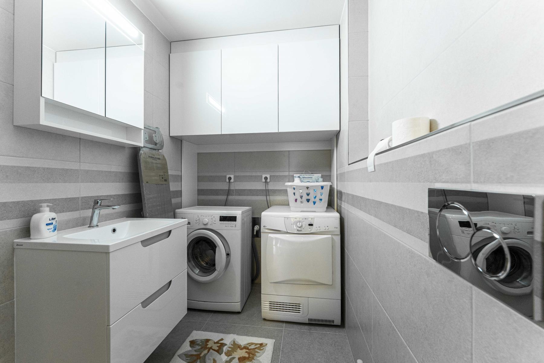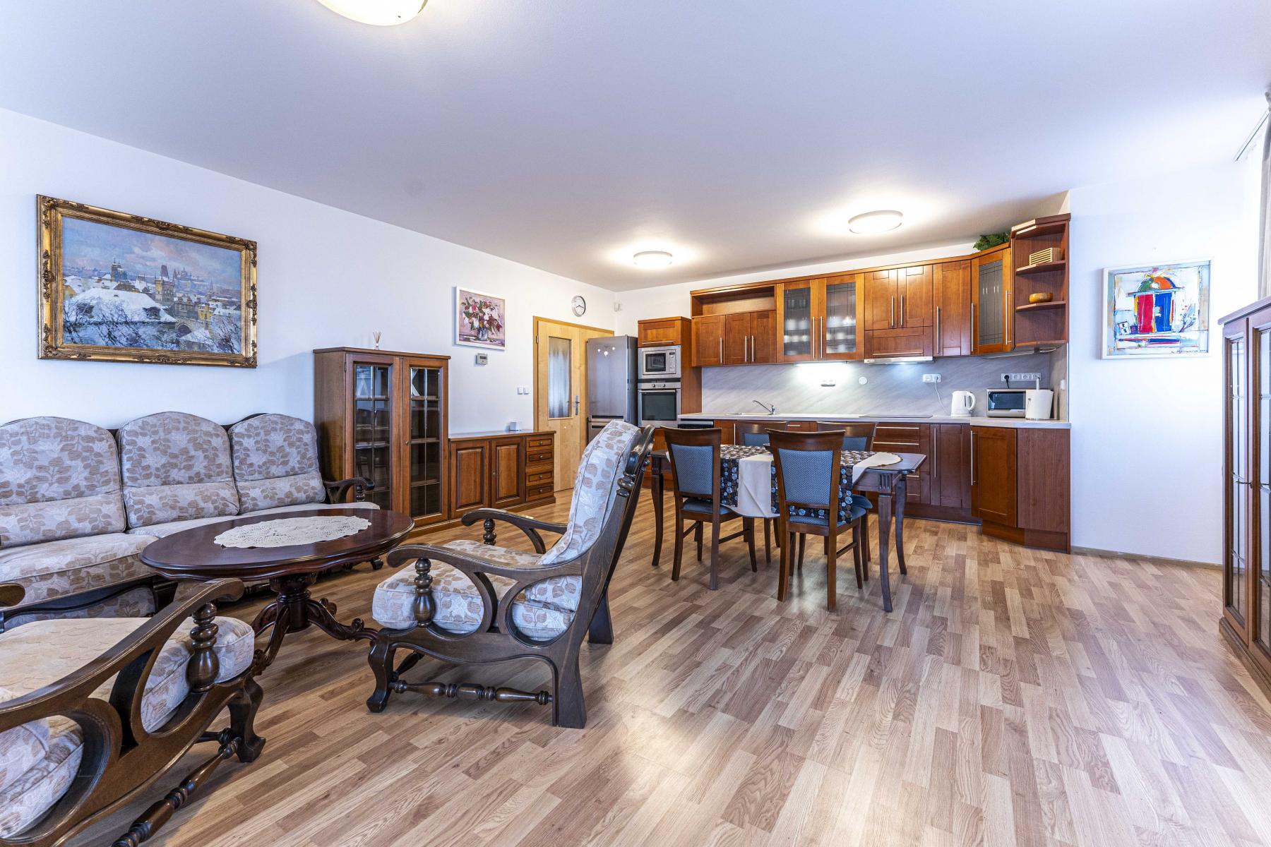 Dispozice: vstupní chodba se vstupy do 2 ložnic, technické místnosti vybavené pračkou i sušičkou, obývacího pokoje s kuchyňskou linkou zařízenou běžnými spotřebiči.