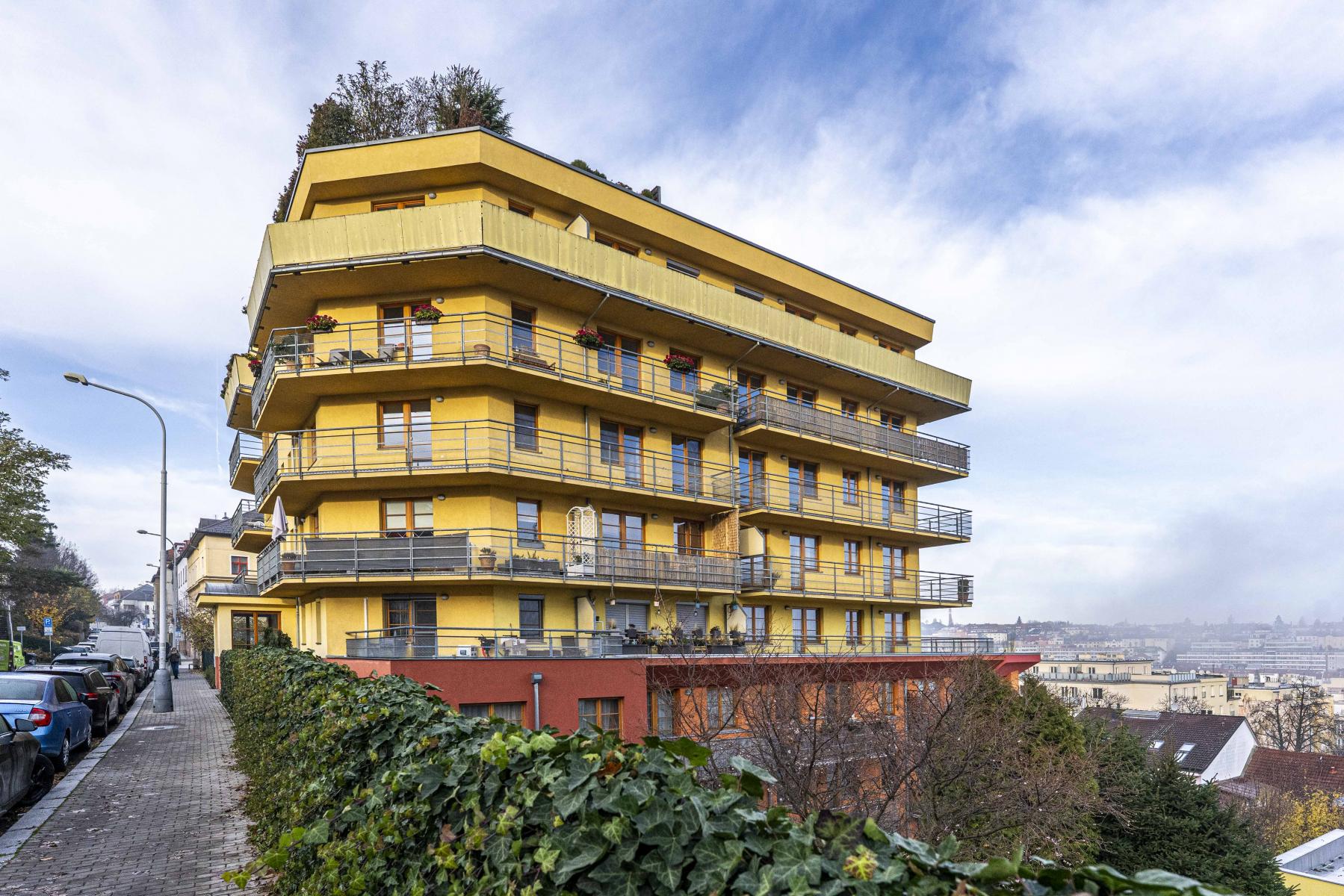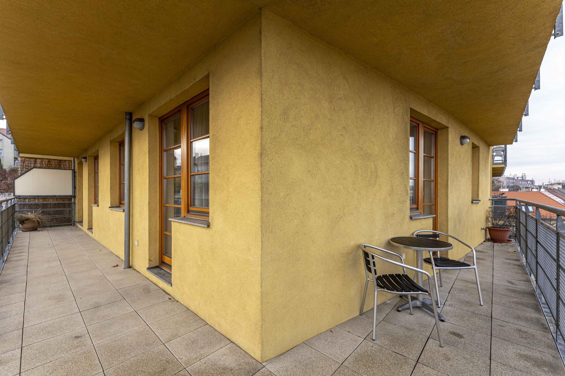 Byt obklopuje ze všech stran terasa s krásnými výhledy na okolní Břevnov, celkem i s terasou má byt cca 110 m2.