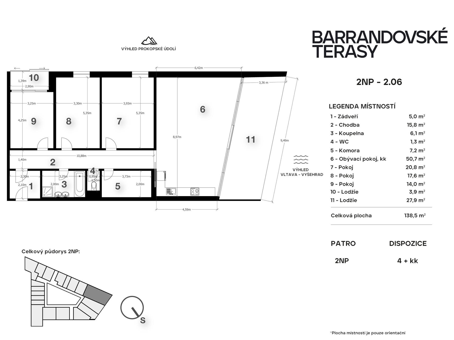 Výjimečnosti prostředí a architektury odpovídají i nabízené apartmány s výhledem do Prokopského údolí a zeleného horizontu protilehlých kopců, další pak směrem do městského centra a na Vyšehrad nebo na řeku a protilehlý Braník. Kouzlo výhledů umocňují velkoryse pojaté lodžie, na nichž se stírá hranice mezi klidem apartmánu a vnějším světem metropole. Třívrstvé masivní dřevěné podlahy v obytných místnostech, italské obklady a dlažba v koupelně, velkoformátová okna s termoizolačními trojskly, vstupní bezpečnostní dveře, vybavení značkovými spotřebiči a domácí videotelefon jsou jen některé z vysokých standardů jeho interiéru. Součástí apartmánu je základní vybavení nábytkem pro jeho plnohodnotné užívání. Samozřejmostí je možnost pronájmu parkovacího stání.