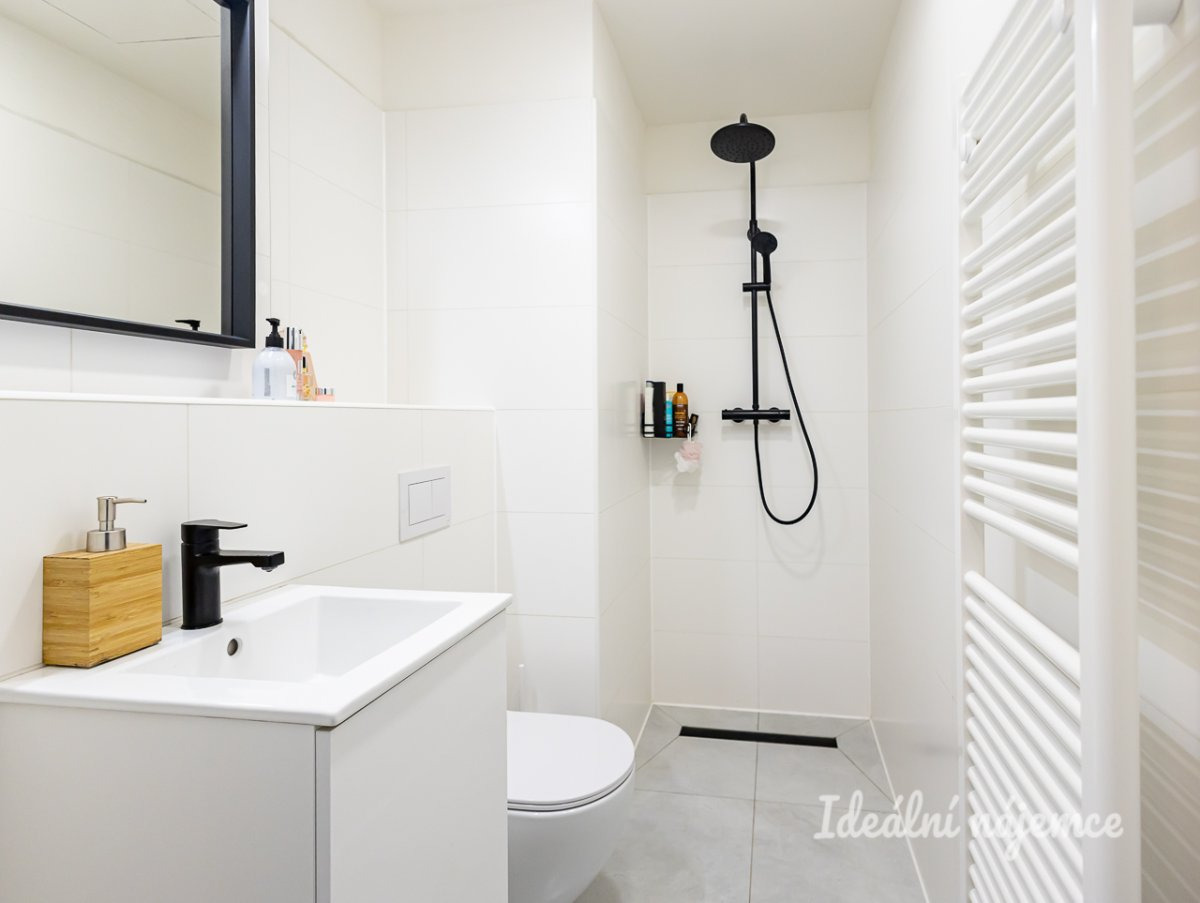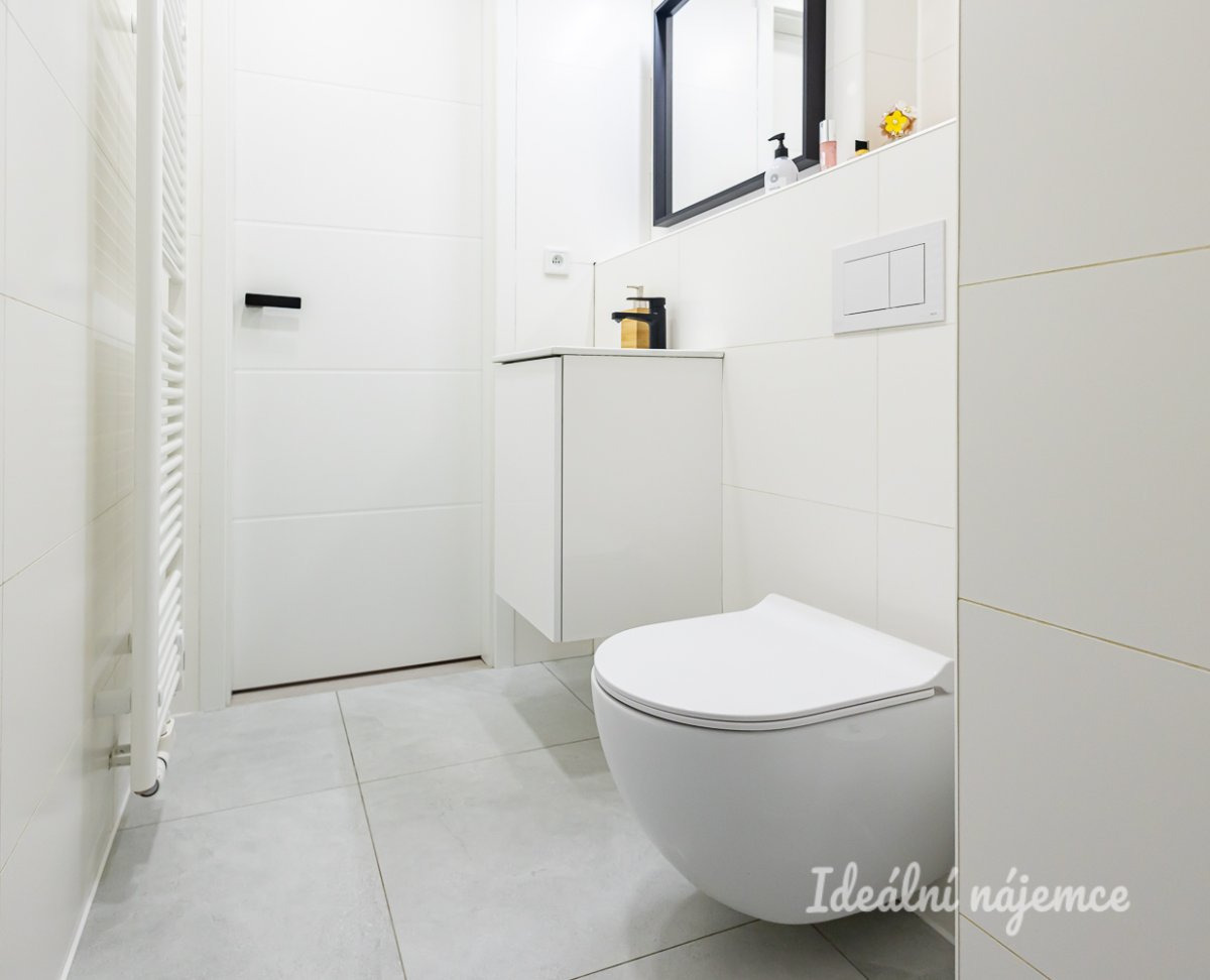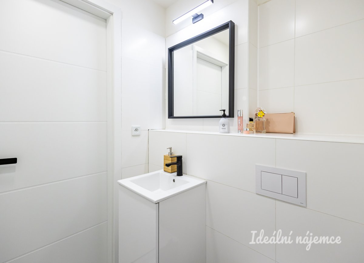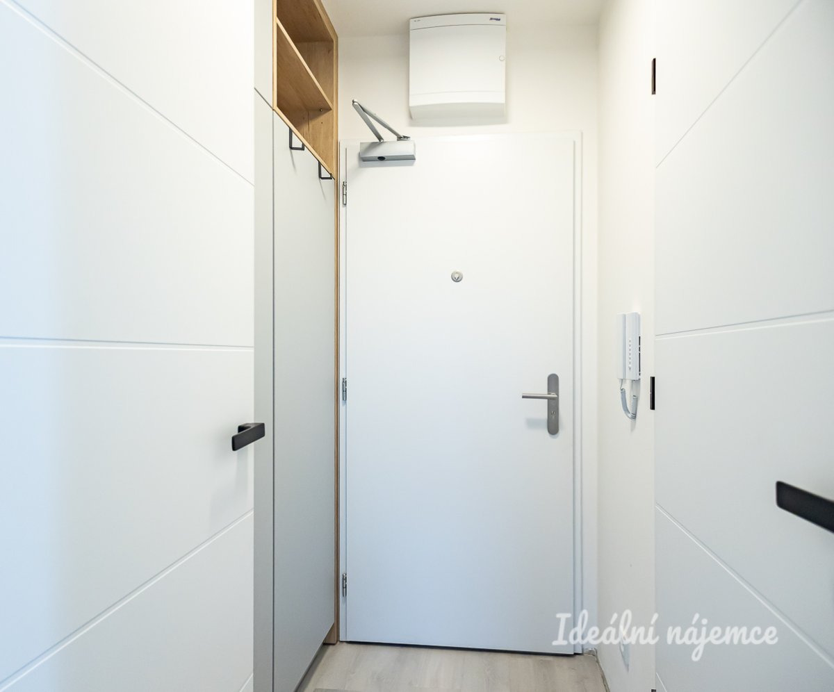V chodbě se nachází vestavěná skříň. Kuchyň je vybavena pračkou, elektrickou troubou, varnou deskou a lednicí. V obývací části se nachází postel. Elegantní koupelna je vybavena sprchou, umyvadlem se skříňkou, zrcadlem a toaletou.