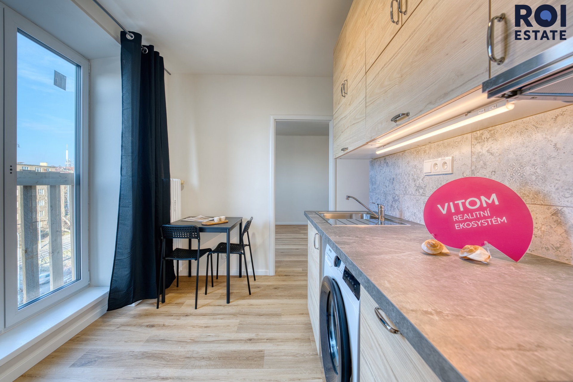 Mezi vybavení bytu patří kuchyňská linka s dvouplotýnkovým vařičem a lednicím s mrazákem. Kuchyňka je skromná, skvěle však plní svou funkci. Koupelna se sprchovým koutem, toaletou a pračkou v kuchyni.