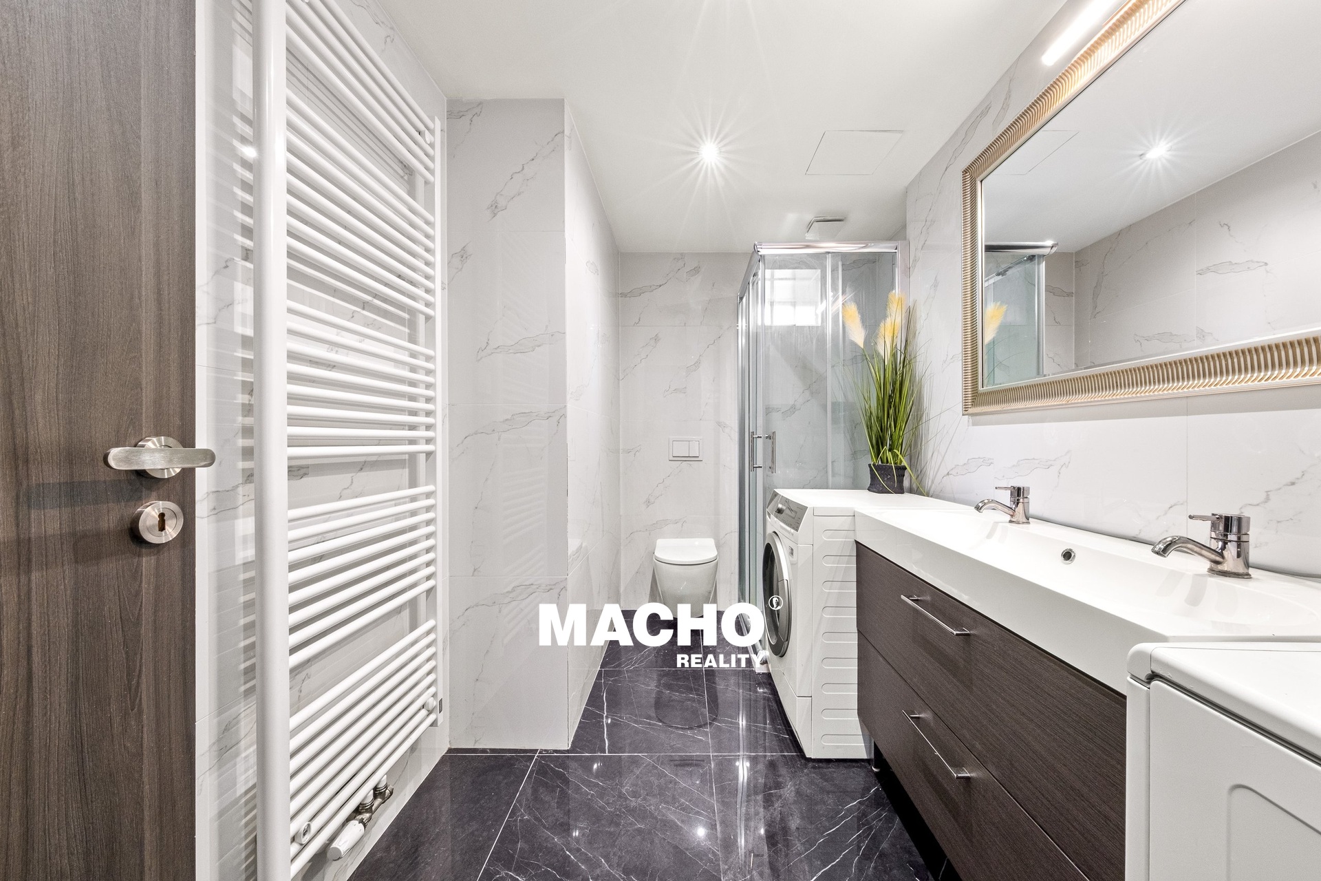 Kuchyň je vybavena všemi spotřebiči – lednicí s mrazákem, myčkou nádobí, troubou, sklokeramickou varnou deskou a digestoří.