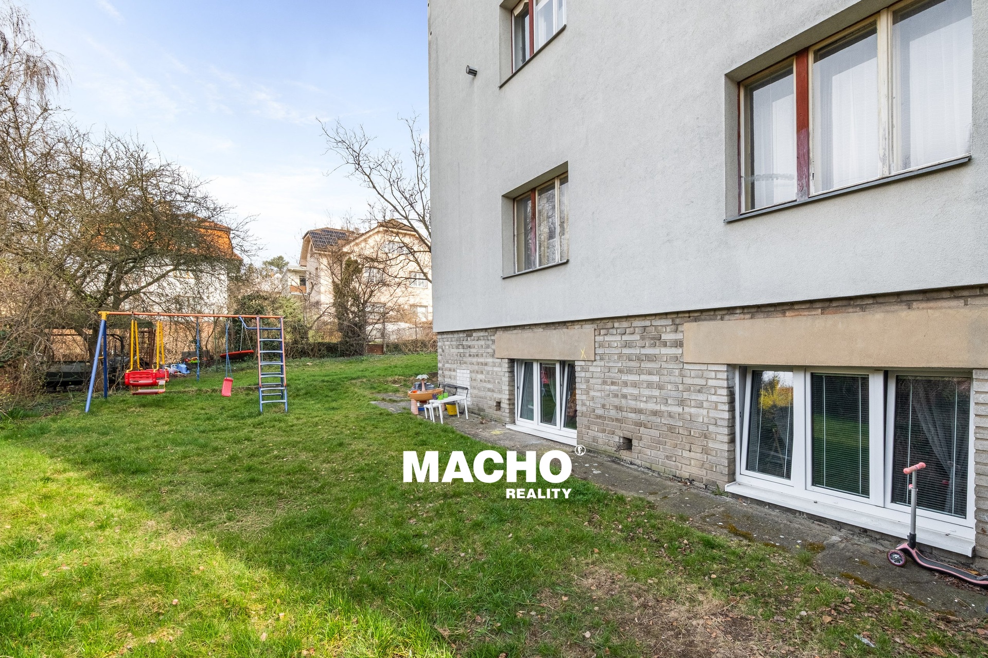Byt se nachází ve sníženém přízemí, přičemž jeho okna směřující do zahrady jsou zcela nad úrovní terénu, což zajišťuje dostatek denního světla a příjemnou atmosféru.