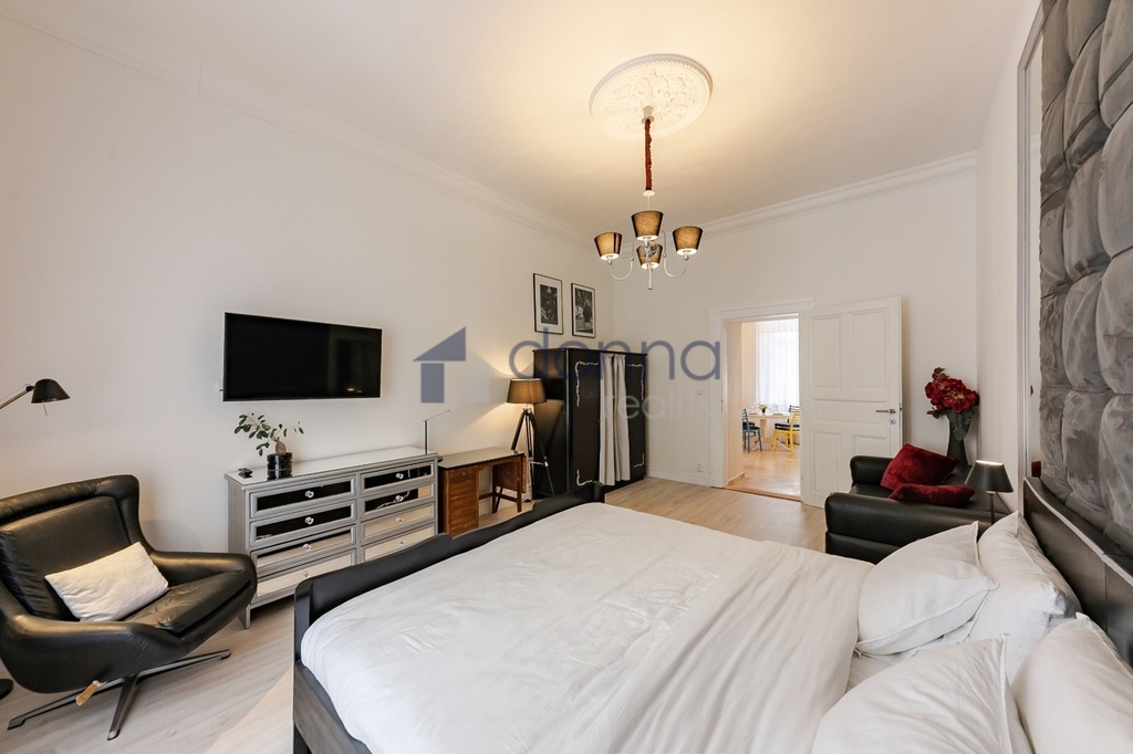 Velký pokoj (ložnice + obývací část) je vybaven odhlučněnou stěnou, velkou designovou manželskou postelí se dvěma nočními stolky, velkou smart TV, křeslem s lampou na čtení, pracovním stolem se židlí, velkou skříní, pohodlnou pohovkou a konferenčním stolkem, velkým oknem.