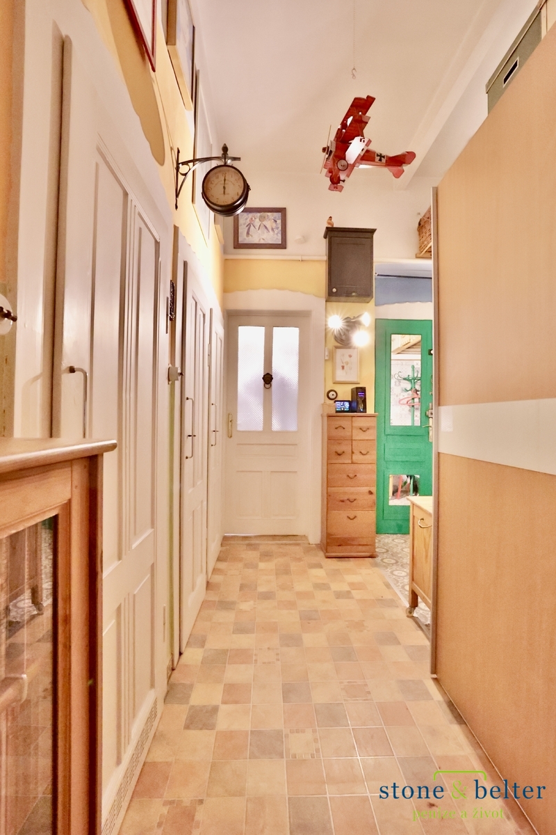 - V bytě se nachází komora s regály a vysoké stropy poskytují dostatek odkládacího prostoru.