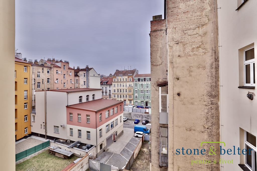 Okna kuchyně směřují na východ do tichého vnitrobloku, obývací pokoj do klidné ulice směr západ. Plastová okna dobře těsní a o vytápění se starají plynová topidla WAW.
