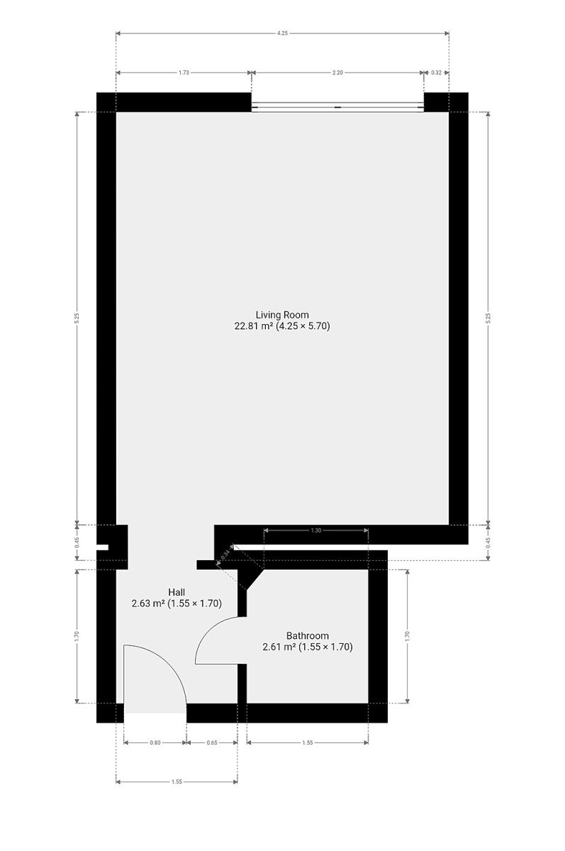 Skládá se ze vstupní chodby, koupelny se sprchovým koutem, toaletou, pračkou a umyvadlem a obývacího pokoje s kuchyňským koutem.